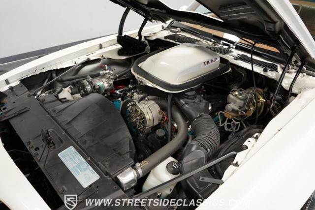 A rebuilt matching numbers 400 V8 powers this Firebird, bored .030 over and equipped with KB pistons, Eagle rods, and a Crower cam. An Edelbrock Pro-Flo 4 multiport fuel injection system and computer-controlled distributor optimize performance. The 200R4 overdrive 4-speed automatic transmission, rebuilt by California Performance Transmissions, features an 1800-2000 stall converter. A 10-bolt rear end with 3.73 gears puts the power to the pavement. QA1 adjustable coil overs and tubular front control arms sharpen handling, while Wilwood dual-piston front disc brakes and a Leed rear disc brake conversion provide strong stopping power.