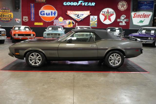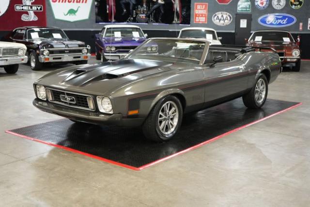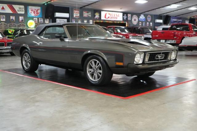 This 1973 Ford Mustang Convertible offers classic style with modern upgrades. Powered by a 351 Cleveland V8 paired to a C6 automatic transmission and a Ford 9\" rear end with 2.75 gears, it delivers smooth cruising power. Equipped with power steering, power brakes, front disc brakes, and a power convertible top, it\'s built for comfort and convenience. A HEI-type distributor, Edelbrock 4-barrel carburetor, and aluminum intake enhance performance, while 16\" late model Mustang wheels wrapped in Uniroyal Tiger Paw Touring tires add a sporty stance. Finished in gray paint with black and red Mach 1 stripes, this drop-top turns heads.