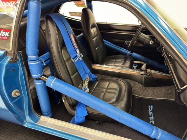 Standard Duster door panels are tidy black vinyl covers with a woodgrain insert and that\'s pretty much where the stock appearance ends. Turning towards the cabin, you\'re met with blue foam covers on a roll cage, leading to high backed bucket seats in handsome, stitched charcoal vinyl in very nice condition, with racing harnesses and the back seat that look unused. A three spoke Mopar Tuff wheel leads to the instrument cluster, which is an array of original, classic gauges and some newer AutoMeter SportComp dials and an auxiliary toggle switch panel for fuel, fan, and power. Perched on the dash pad is a large tachometer and shift light and in the center console, a B&M shifter is poised for some good times, based on what we see as a snakehead shaped console. Loop carpet is placed on the floor and the perforated headliner is in place up above in decent condition.