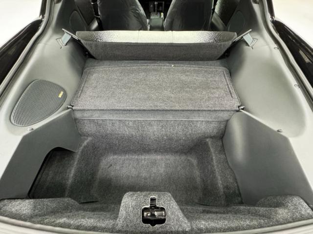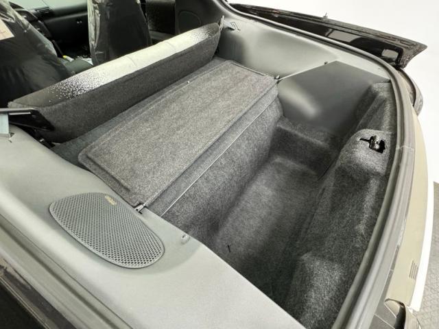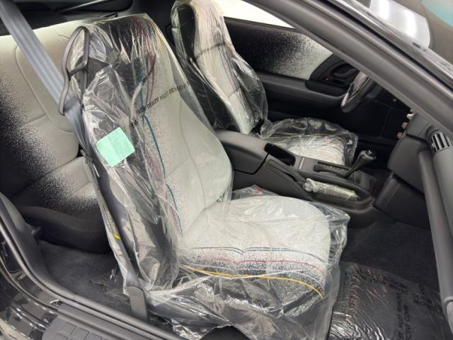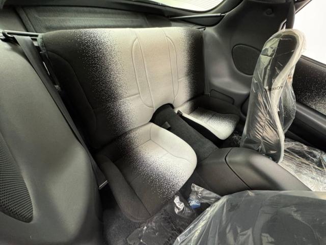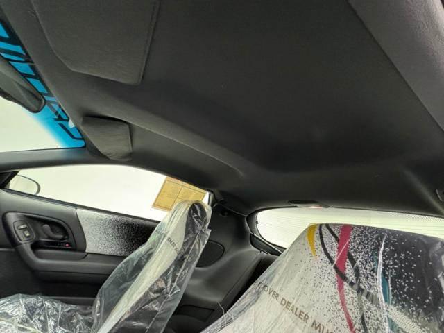 Not unlike the exterior, we see cloth seats that have a white to black confetti fade, and an overlay of more colorful ribbon still wrapped in their factory plastic. Front buckets and a rear 2 plus 2 (sans colorful ribbons) make up the passenger compartment. These present as showroom new. A crack free dash houses all the essentials, and a tight headliner looks down on all this amazing activity going on in the fabric pattern.