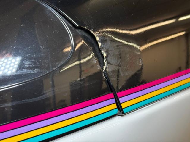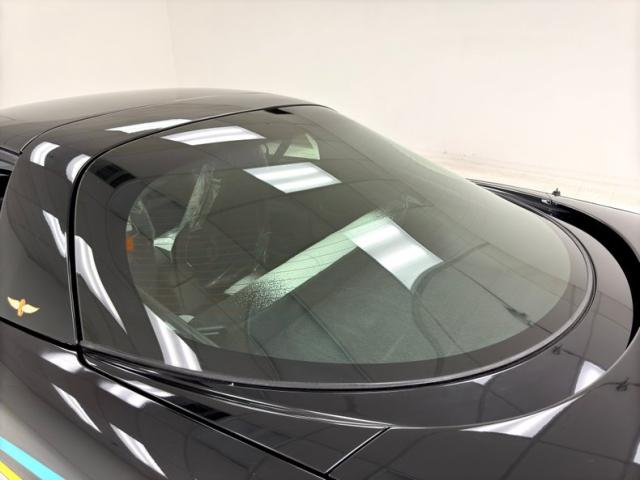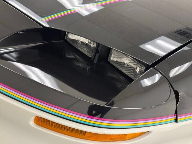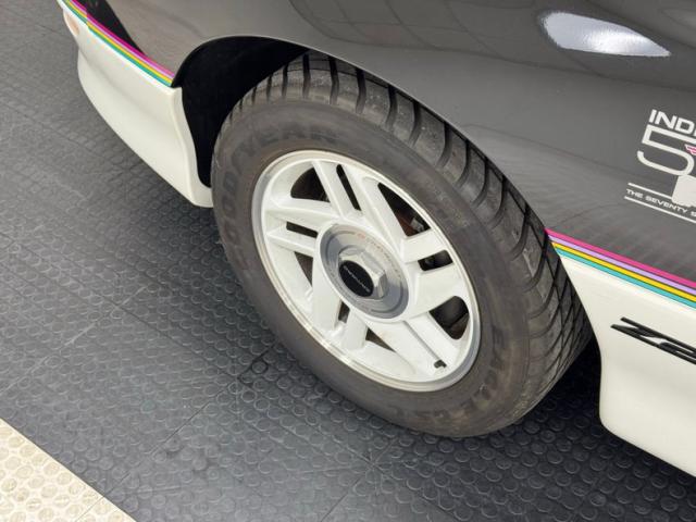 Like a Tuxedo that attended a party, we have black to the 3/4 waterline, then white on the lower quarter. Beautiful unmarred ribbonlike colored pin striping rides the wind and whips from front to back of this car on either side. A speeding Indy car graphic is on the door panel, and special badging of the wing and wheel Speedway logo since its inception, grace the panels as well. Fantastic white wheels are noted on all 4 corners and carry the white all the way around through the lower quarter of the car. The hatchback has a small spoiler attached to the rear of it. \"Removable \"T\" tops are noted on the roof.