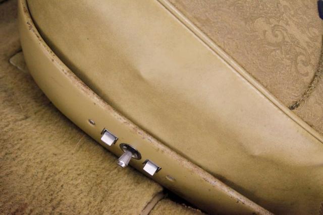 Inside makes use of gold molded vinyl door panels, with a horizontal area of gold suede. A brushed stainless panel in the armrest houses the power windows, locks and mirror joystick. With plenty of padding and wrapped in medium gold dynasty broadcloth we see a split bench in front, and a full bench in the rear, major center flip up and down armrest, one is tempted to ask \"wheres the damn remote?\" Bolsters are in gold leather and are smooth with some piping on the edging, and uppers have 3 buttons. Talk about convenience options, power steering, power brakes, power windows, power seats, and climate control, all at the touch of a button. Also the factory AM/FM stereo residing within the dash, and just below is a CB unit and an early car phone. Seen also is more of the nicely stained tiger maple added in as accenting for the gauge dash front panel covering. Beautiful thick pile antique gold carpeting is on all floors and is pretty clean and unfaded. The above headliner is also lighter gold, and is nice and tight.