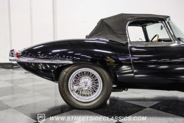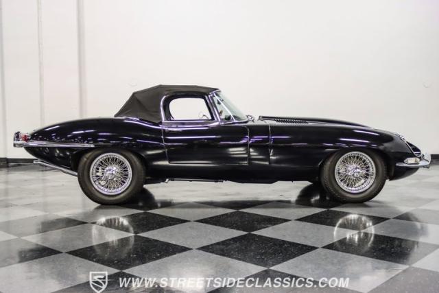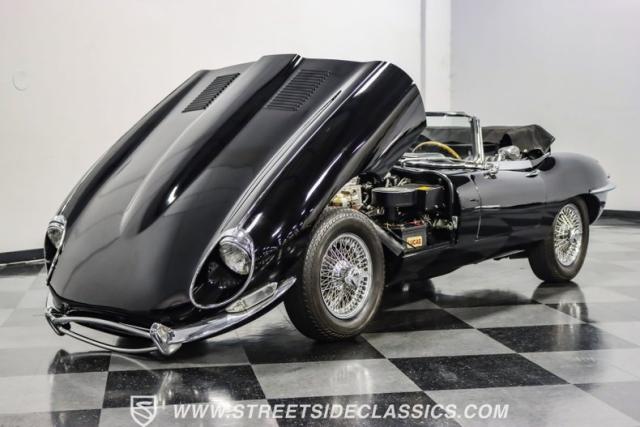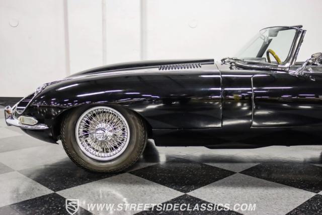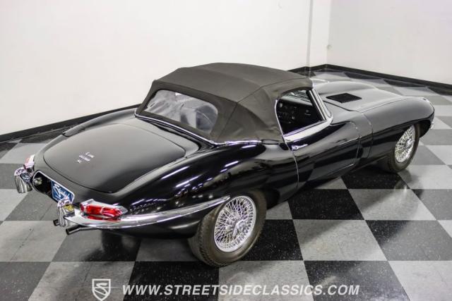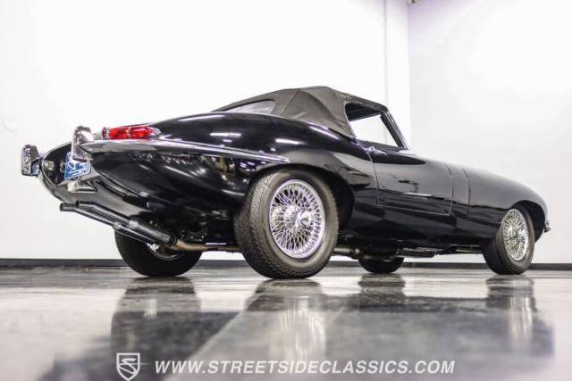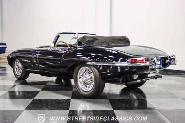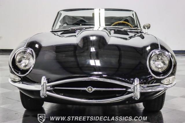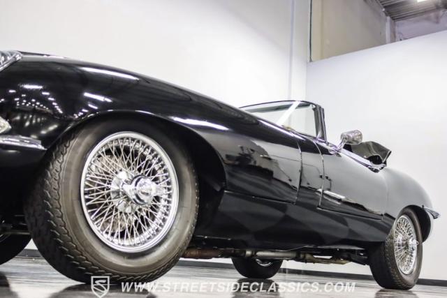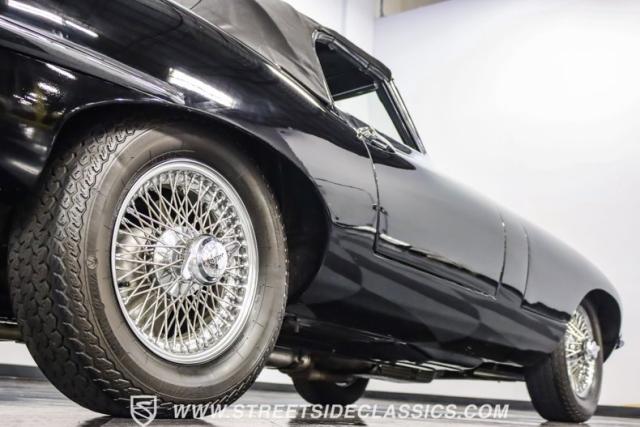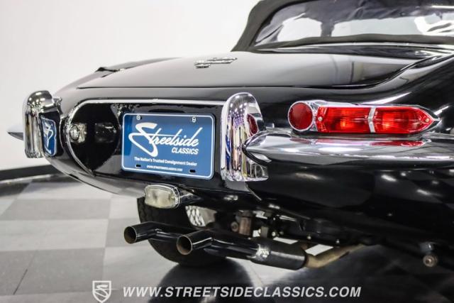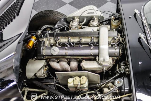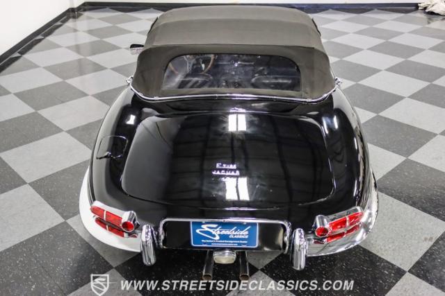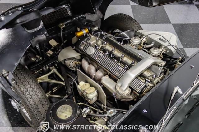 The black paint creates an arresting presence, complemented by genuine wire wheels with knock-off spinners. A black cloth convertible top with boot cover maintains the monochromatic theme. Chrome accents and dual exhausts emerging from the center add distinguished details to the classic lines. Rolling on 185HR15 tires on all four corners, this Jag\'s stance is pure performance.