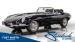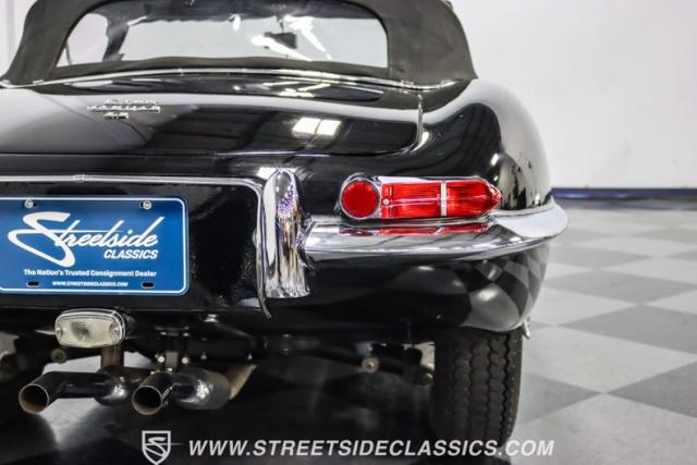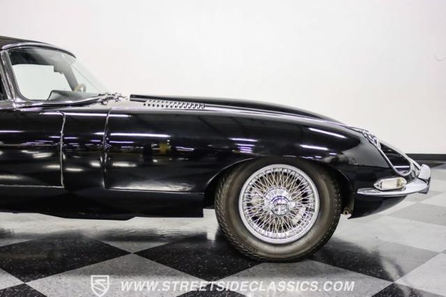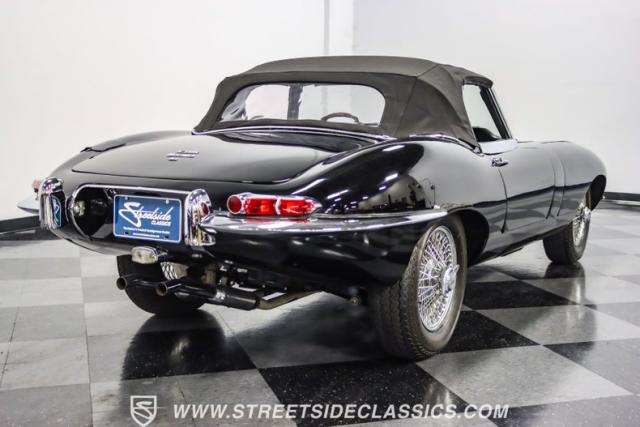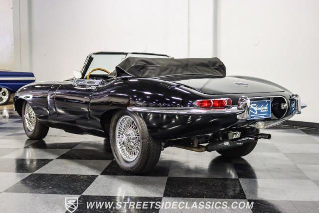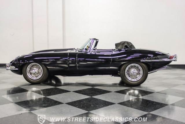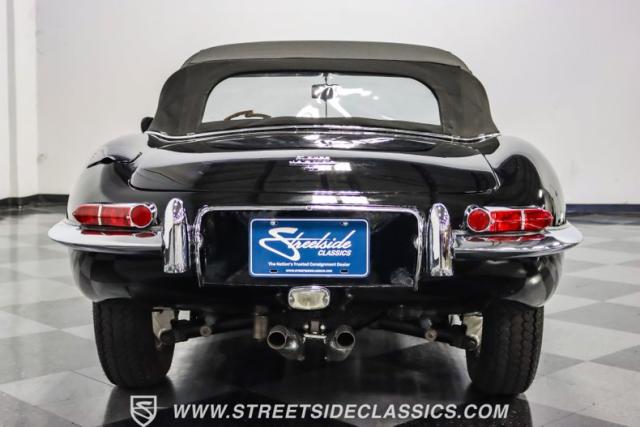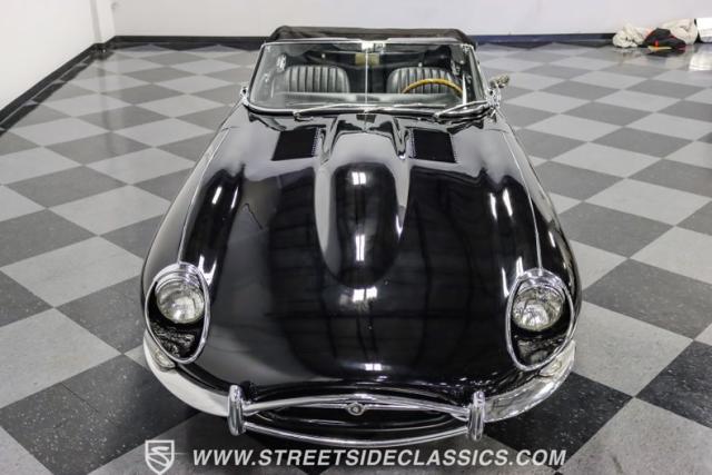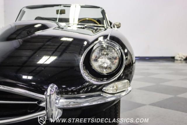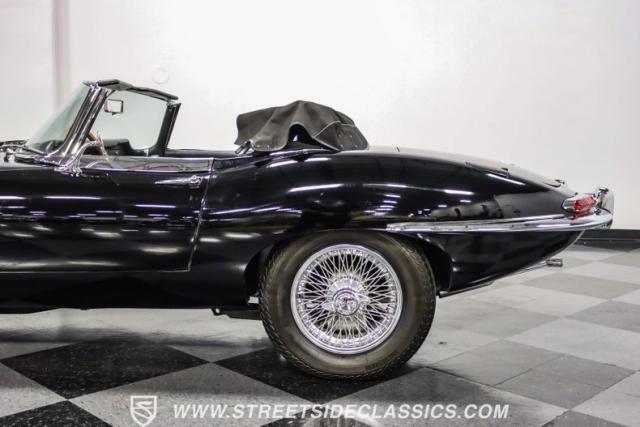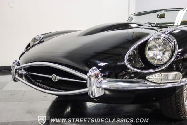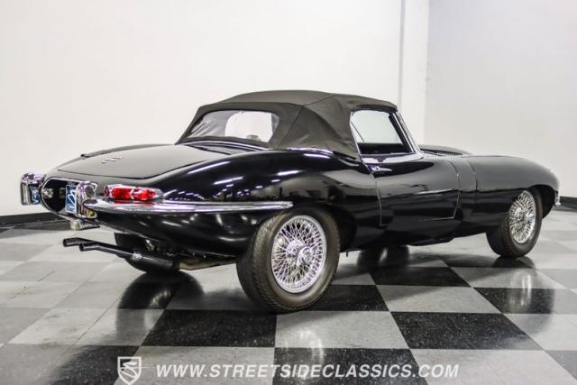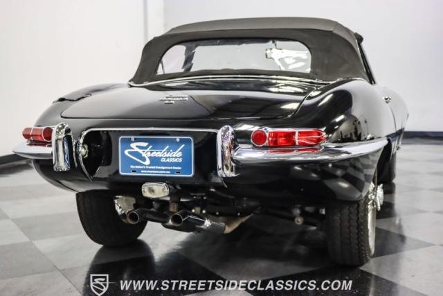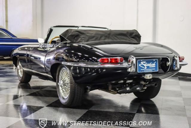 The black paint creates an arresting presence, complemented by genuine wire wheels with knock-off spinners. A black cloth convertible top with boot cover maintains the monochromatic theme. Chrome accents and dual exhausts emerging from the center add distinguished details to the classic lines. Rolling on 185HR15 tires on all four corners, this Jag\'s stance is pure performance.