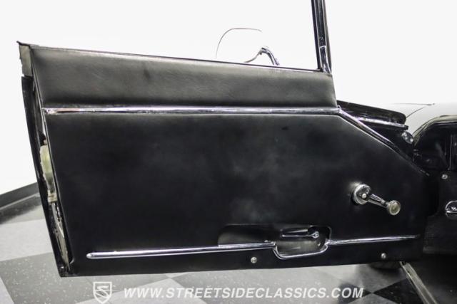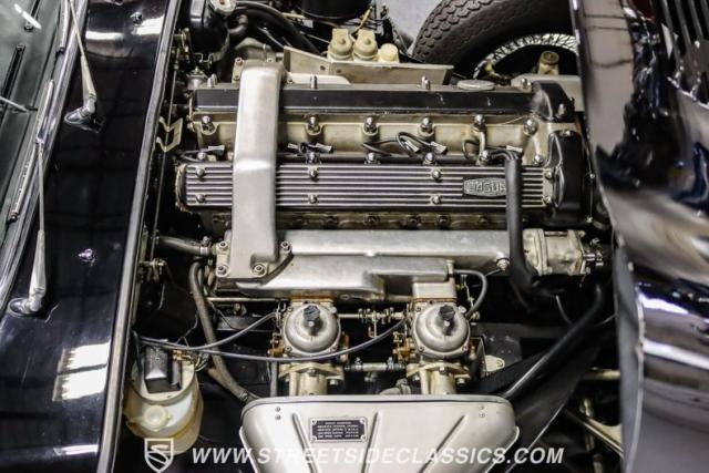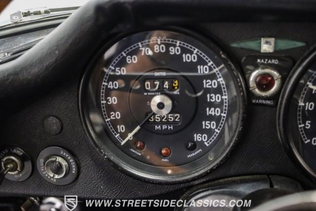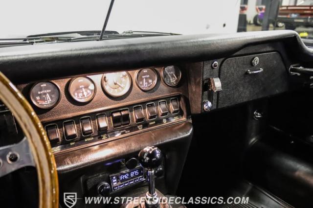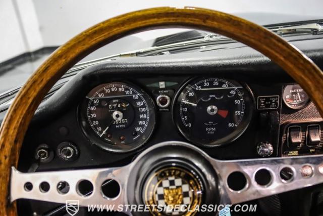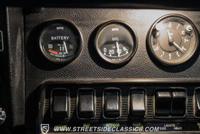 The black leather interior delivers pure British luxury. Bucket seats with a center console create an authentic sports car environment. The Smiths gauges remain clear and crisp across the dash panel, while a digital AM/FM/AUX stereo brings modern audio capabilities. Power windows, leather-wrapped steering wheel, and seatbelts round out the cockpit\'s amenities. The carpet, door panels, and console maintain their proper fit and finish throughout.
