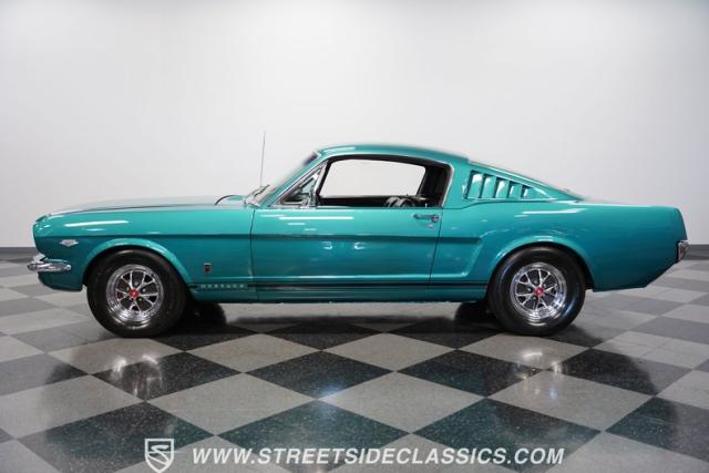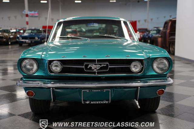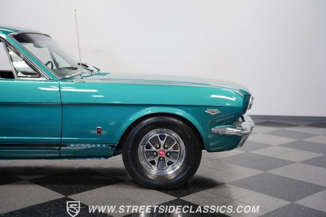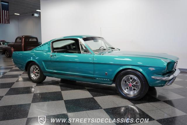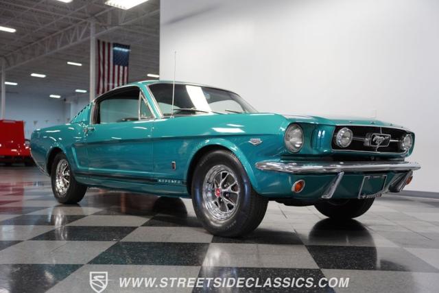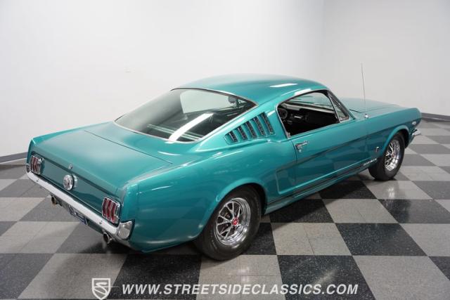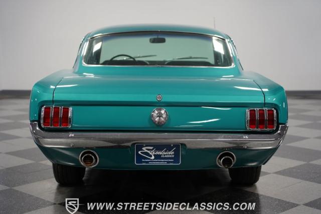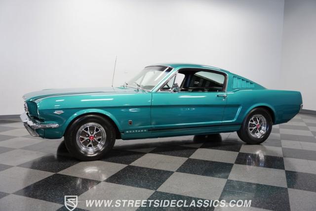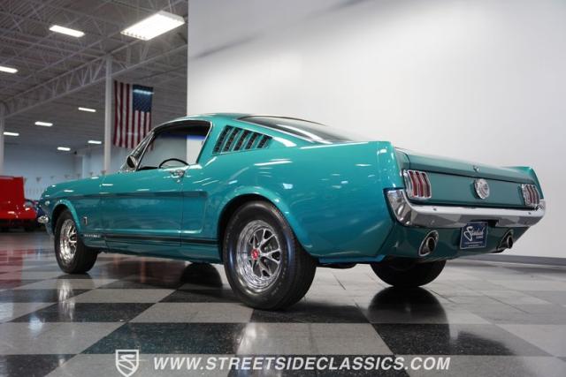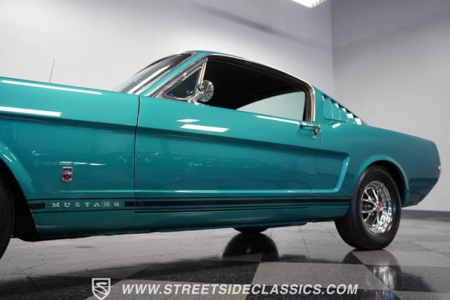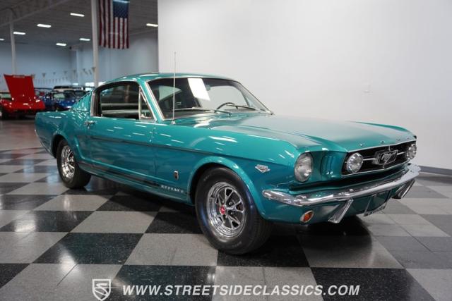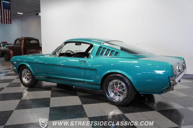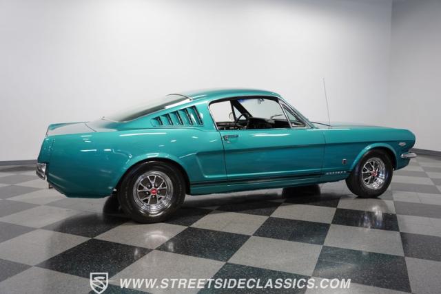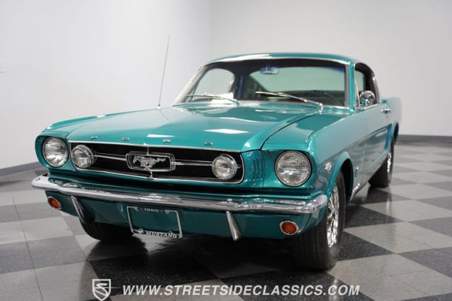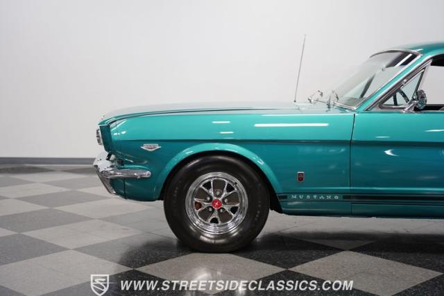 Cruising through time with a color that turns heads and an engine that roars with each turn of the key, this 1965 Ford Mustang GT Fastback paints the streets in a shade of Tropical Turquoise that\'s as refreshing as a dip in a calm ocean on a hot summer day. Equipped with chrome wheels wrapped in Michelin tires measuring 215/70R14, this Mustang is not just about its striking looks. The full repaint, complemented by GT badging and trim and trumpet-style exhaust tips, elevates it to a masterpiece of the muscle car era.