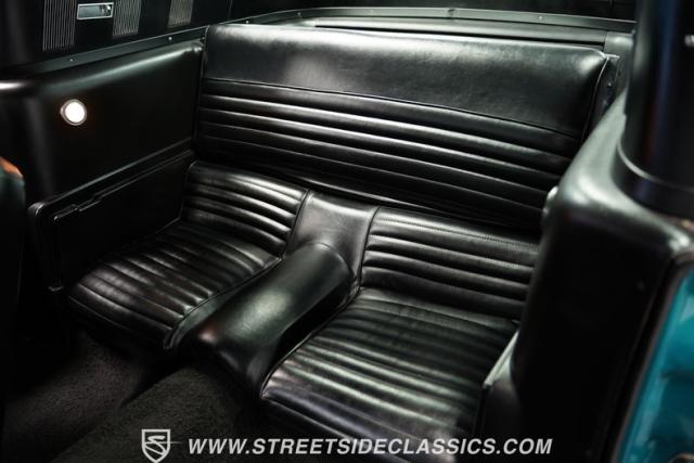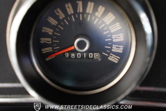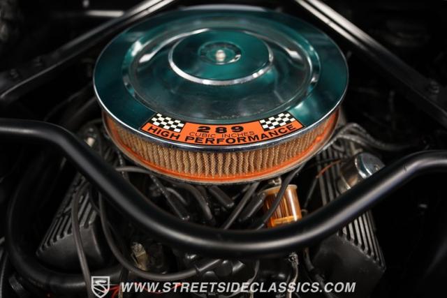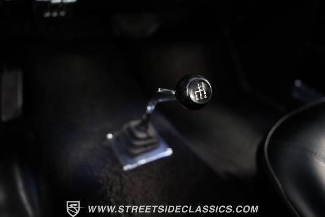 The black interior showcases a restoration that honors its roots in both style and substance. Black vinyl bucket seats and a floor shifter are wrapped in an environment where every element presents well, from the carpet to the headliner and the dash pad. The AM radio still captures the airwaves with the same clarity as it did decades ago.
