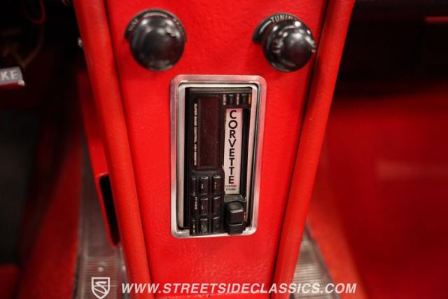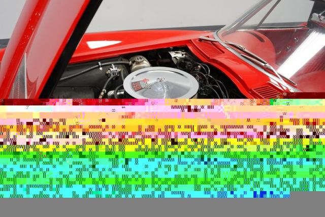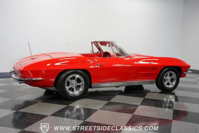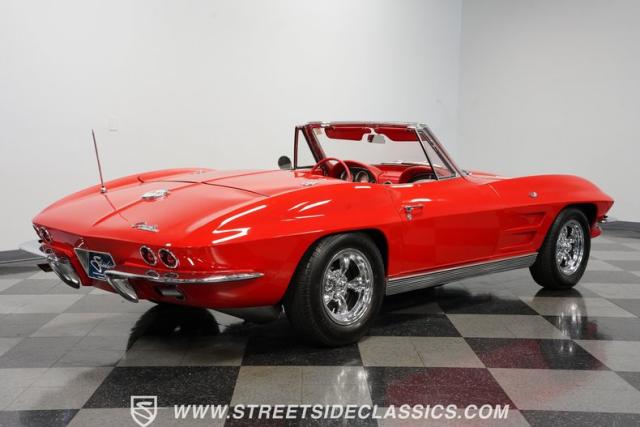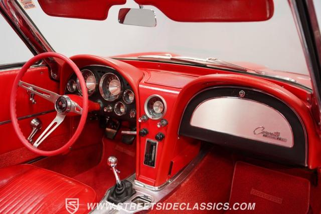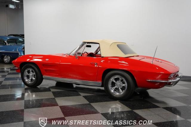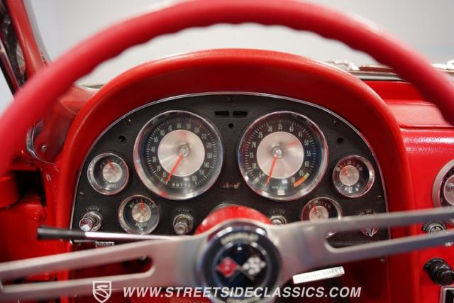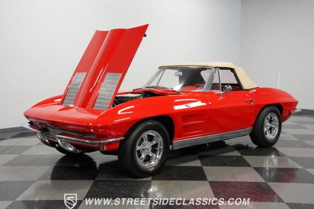This 1963 Chevrolet Corvette Convertible is a true American icon, sporting the classic body design that made it a legend. Riverside Red paint gleams across its sculpted body, a color that perfectly captures the era\'s bold spirit. Chrome bumpers and door handles add a touch of class, while the hood vents give it an aggressive edge. The tan vinyl convertible top provides a stylish contrast, ready to drop immediately for open-air cruising. Rolling on 15\" American Racing wheels wrapped in 205/70R15 front and 215/70R15 rear tires, this Corvette\'s stance is classic and commanding.