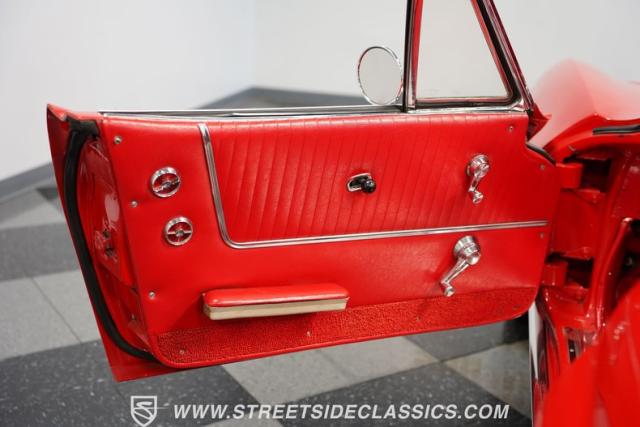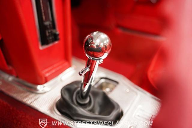 Step inside, and you\'re greeted by a sea of red vinyl that screams 1960s cool. The bucket seats offer comfort and style, while the floor-mounted shifter puts total control at your fingertips. An AM/FM cassette player stands ready to provide the soundtrack for your journey. The door panels look freshly redone, maintaining the car\'s period-correct aesthetics. The gauges are clear and functional, giving you all the vital information at a glance. This interior is a well-preserved time capsule, offering a genuine 60s driving experience.