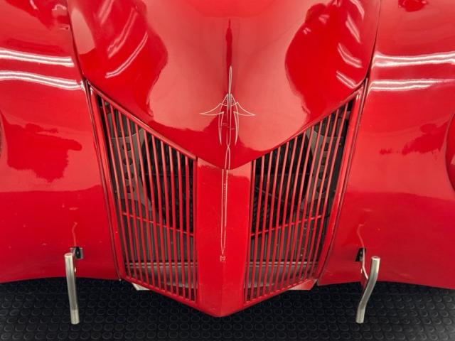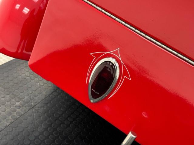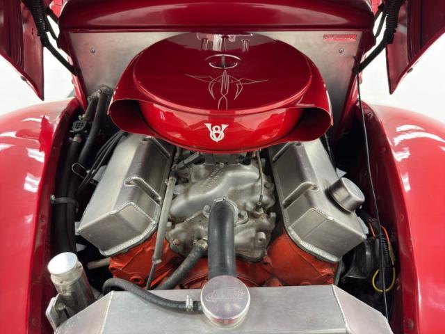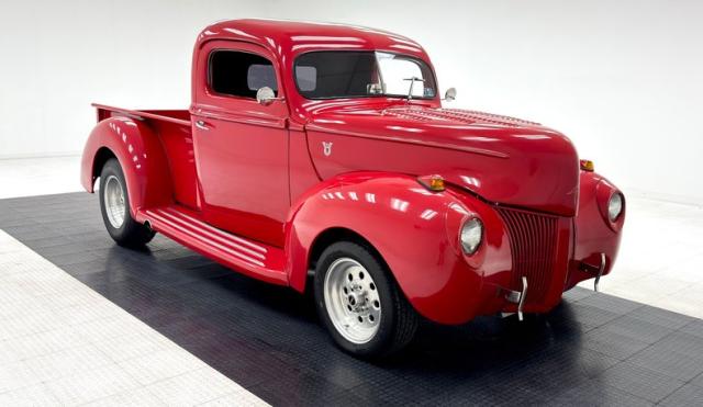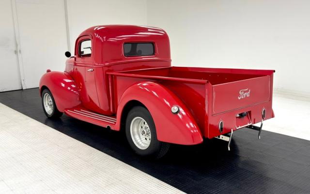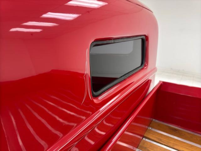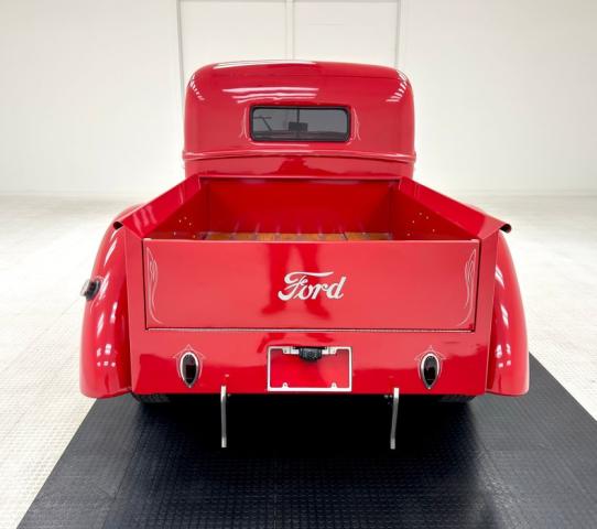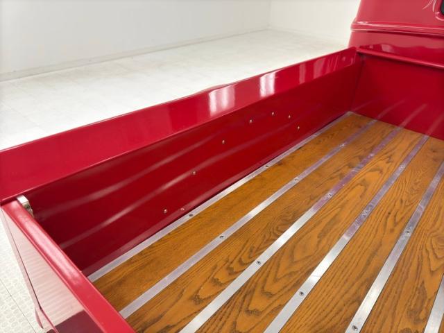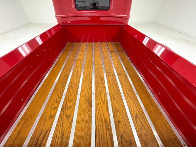 It\'s not that red wasn\'t available in 1941, the color brochure from the day proves it was. But two stage paint technology covers this truck, so it gleams like never before. Under the prominent nose of the big hood, the vertical strakes of the grille have been color matched as have the headlight rings. That hood is pinstriped and louvered leading to the narrowed windshield and chopped top, while wide running boards contain cut outs for the exhaust on each side, just before wide rear fenders sweep back gracefully to the edge of the bed. Inside that bed, oak planks hopscotch over stainless strips that are smooth rather than the typical contoured and looking sharp. Pinstriping is found throughout the exterior including the tailgate where FORD is accentuated with silver paint. 15-inch Weld Draglites make up the racy shoes here, staggered in depth and in tire size. Paint and metalwork is excellent with some imperfections noted as bubbling in low areas, various scuffs and scrapes, touched up chipped areas and scratch.