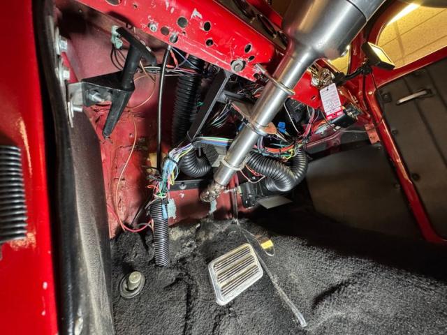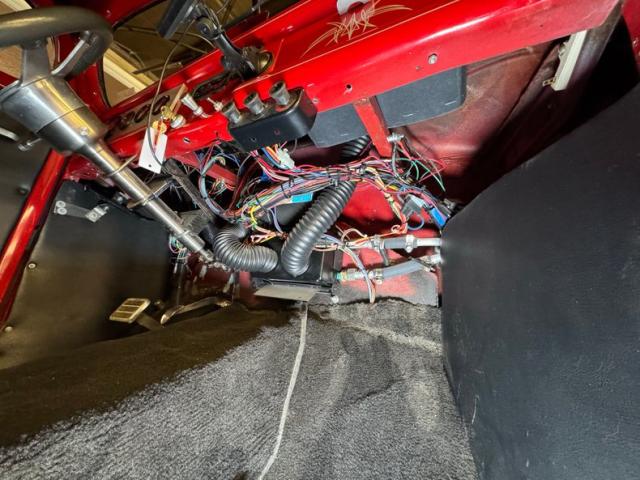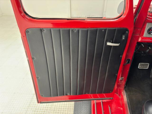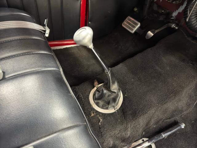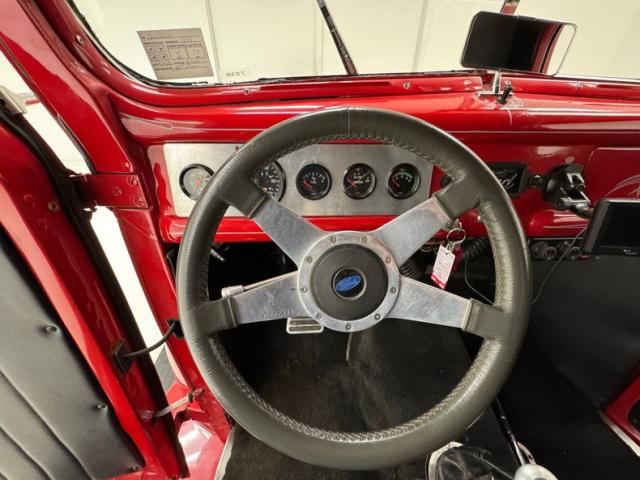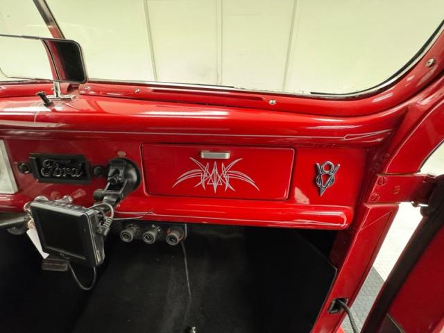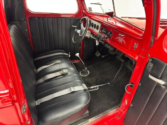 Column stitched black vinyl door cards are framed in red paint on the neat inner doors, and the pattern is echoed on the bench seat which is in very good condition. Greeting the driver is a Lecarra steering wheel with Ford center cap, leading to an aluminum plate panel housing a series of simple VDO gauges, all on a red painted dashboard that shines as well as the outside and is so smooth, that the backup camera monitor is suction cupped to it. The glove box door is adorned with a pinstripe graphic while a Lokar shifter rises from the floor covered in low pile black carpet in good shape, and it\'s all under a smooth black vinyl headliner and rear wall covering.