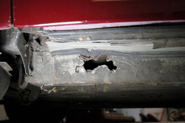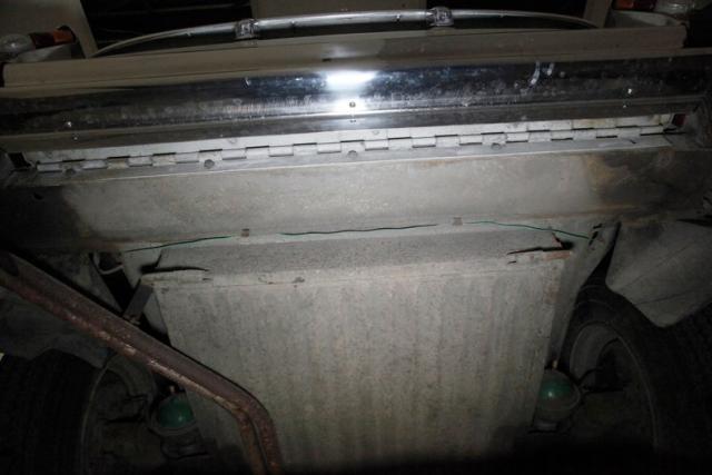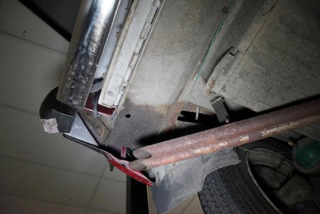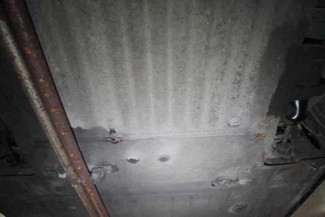 Underneath we see plenty of patina steel undercarriage. There are some invasive rusted areas on the rockers, causing some concern for structural stability. Most of the undercarriage is steel coverings due to no drive shaft making its way to the back. Some green colored \"bomb\" like structures are in each wheel providing the hydropneumatic ride. Disc braking is on front and drums for the rear. The exhaust is a bit surface rusted as is the factory style muffler underneath.