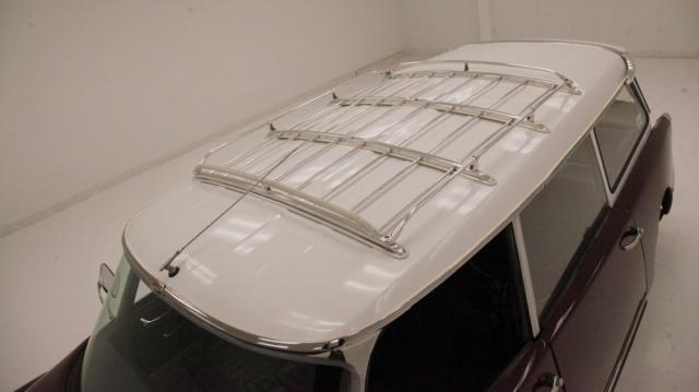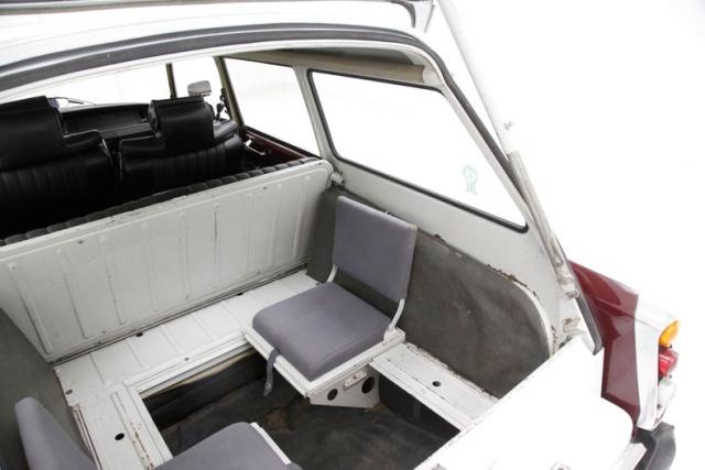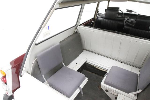 In all its organic form, we seetwo tone maroon with a gray roofline and rear tailgate paint. The body panels are just slightly off and doors hang fairly straight. Save for a trimming that has fallen off the drivers door, (which is included), the bumpers and trimmings are nice and shiny, along with the full fledged roof rack adorning the long sleek roofline. Panoramic glass is there for viewing the outside as you whisk along very smoothly on those winding back roads. Encased head lighting leads the way for the wide toned organically influenced front of the car. A nicely circular curved bumper frames the bottom of the lead of the car, and the lazy V shaped hood is nicely rounded. The front glass wraps around slightly and a chromed mirror hangs off of each door in the front of the automobile. The long spacious rear storage/fold down dual jumpseat back of the car tends to square off a bit and as it turns to light gray we see vertical oriented tail lighting on either corner presenting in Dixie cupped red, yellow and white lights. A simple straight bumper is on the back and remains nice and shiny, and the tailgate lifts easily for plenty of rear access. The car floats on 185R15 redline tires covered by chromed squared off dog dish style wheel coverings.