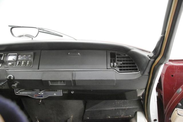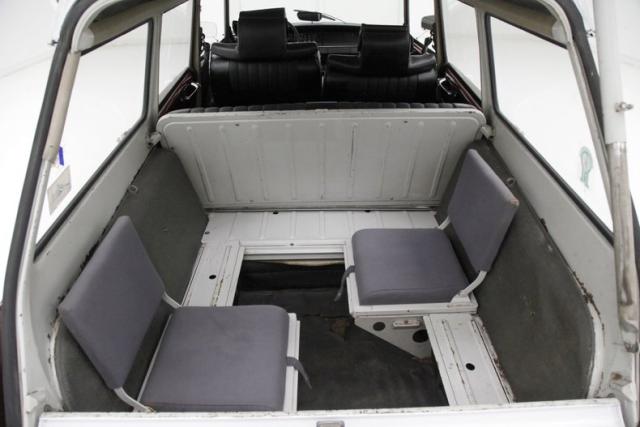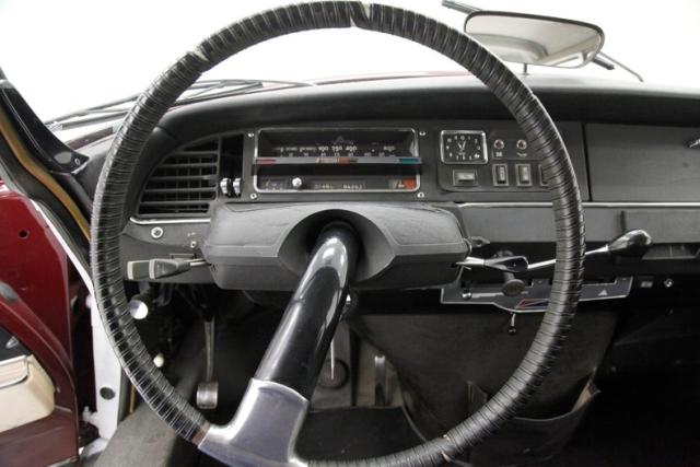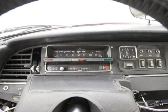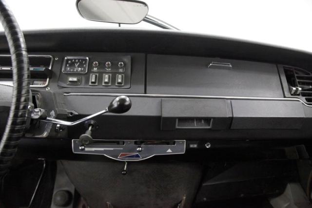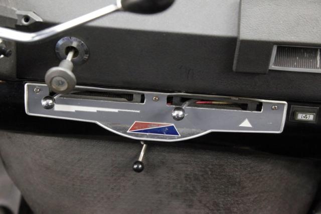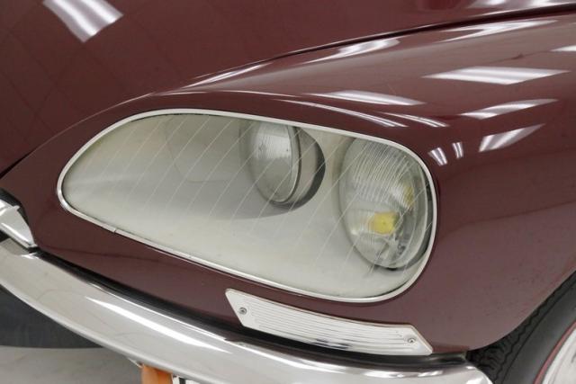 Dee-esse means goddess, and inside we can experience some more heavenly curves starting with the door panels. Here we see shiny maroon painted steel uppers and lowers, all rust free. Inside this steel frame are some futuristic armrests fashioned from black vinyl. An interesting door handle is positioned on the upper front of each door and takes a bit of getting accustomed to for its operation. The window crank is here too also with a white plastic attached storage tray. Climbing inside over the wide sill we can take a seat in nicely preserved black vinyl two individual seat benches with intricate multi position headrests. These are finished with a nice tuck and roll black and white square pattern tweed inserts. A long rear bench stretches from door to second door in back and presents in the same pattern, only with no headrests. This bench can be folded down for a clear open storage space for plenty of gear. Also the back space opens up to reveal two jump seats that can accommodate more passengers. Upfront, the angled dash presents very easy to read and reach for various controls at the touch of a button. An interesting single arm steering wheel comes about from the column and is a typical Citroen feature which is very futuristic looking. A horizontal AC unit hangs from the bottom of the dash and hovers over a sea of clean black carpeting, and above is a nice tight mold cloth covered headliner.