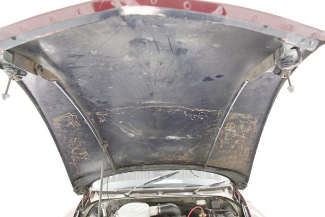 Under that wide hood resides a 132.7 ci 4 cylinder engine. It is in an unrestored but clean engine bay, has a 1-barrel carburetor on top and a 4-speed manual transmission on back with a 4.38 frozen drive axle. The spare tire resides here as well front and center under the hood.