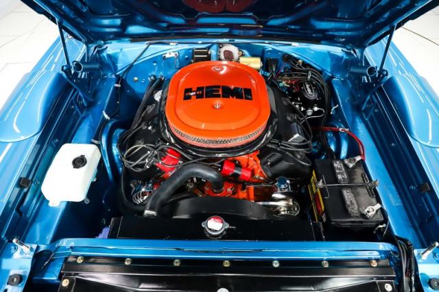 ENGINE COMPARTMENT: Under the hood sits an Elephant on steroids powerplant- a Mopar Mega Block 472 HEMI producing over 600 horsepower! This freshly built engine features dual quad carbs, MSD ignition, coated headers, and is finished in HEMI Orange with factory style air cleaner and crinkle finish valve covers. The front of the engine is equipped with a CVF runner system featuring billet pulleys and brackets, serpentine belt, chrome Powermaster alternator, and chrome power steering components. It runs cool with an upgraded aluminum radiator and factory shroud, and is equipped with a Wilwood master cylinder. All components present fresh and detailed. The three speed wiper motor is in place and functional, along with the complete battery hold down, washer system, working horns, and new vacuum system for the headlights. The engine bay is beautifully finished in B5 Blue, retaining the original fender tag, and the VIN stamp clearly present on the core support.