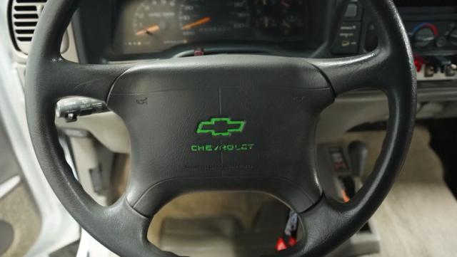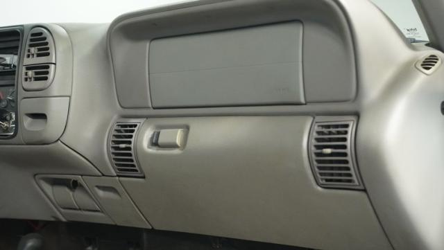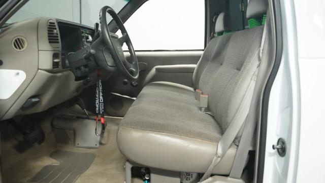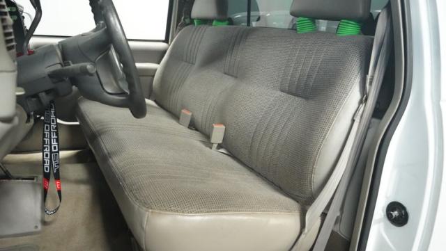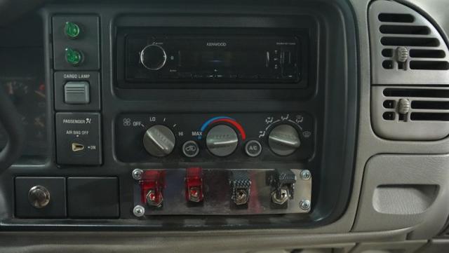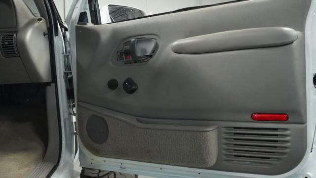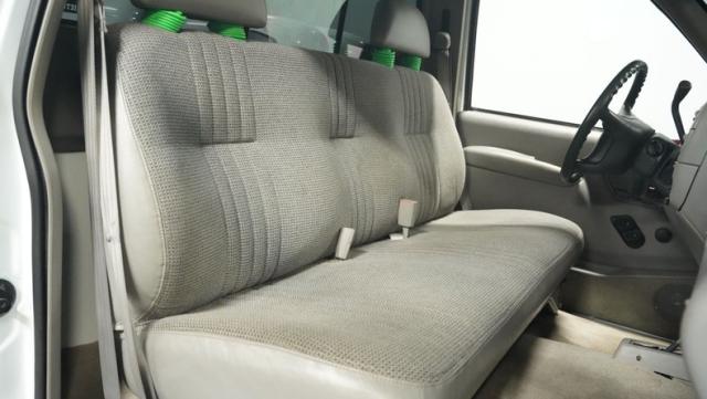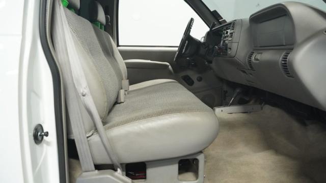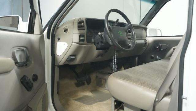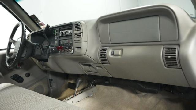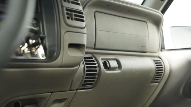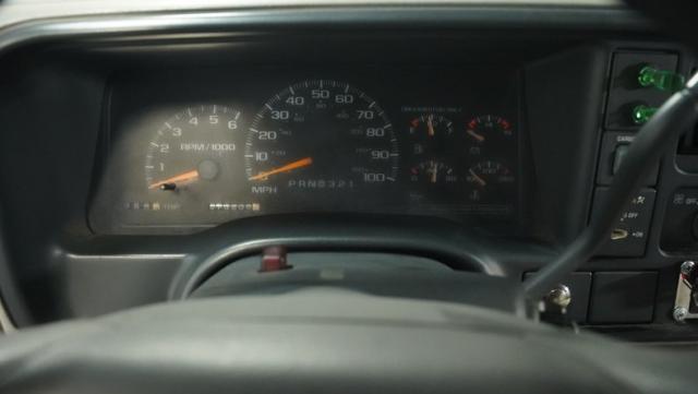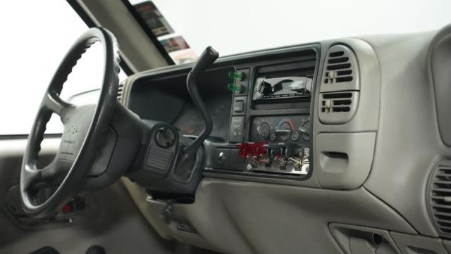 The gray cloth interior keeps things practical with bench seating and a column shifter setup. A Kenwood radio with USB and Bluetooth connectivity provides the soundtrack. Power steering maintains control while the classic GM layout emphasizes function with straightforward ergonomics and purposeful design elements.
