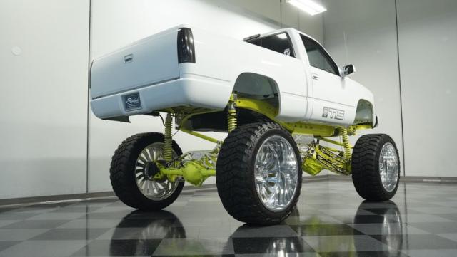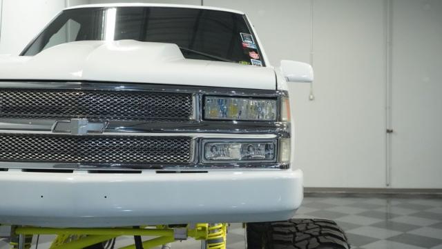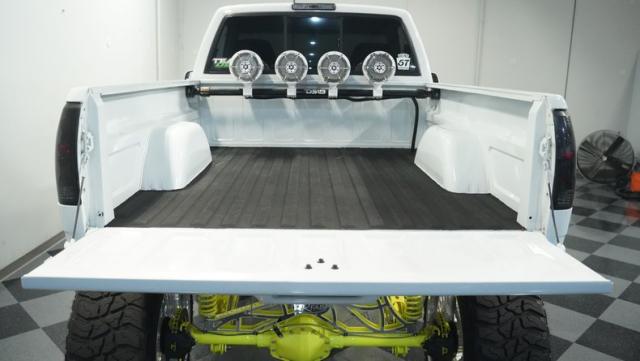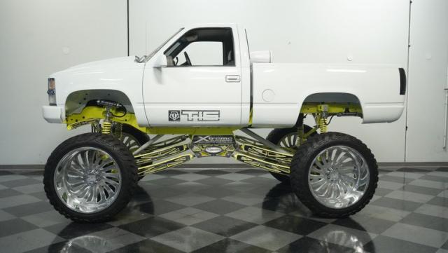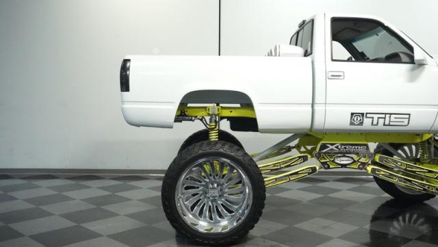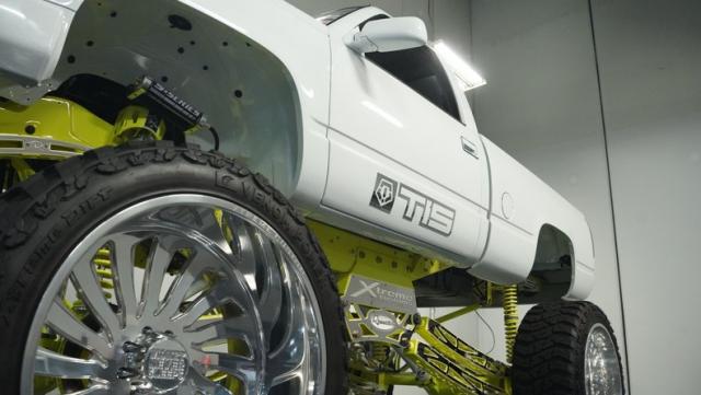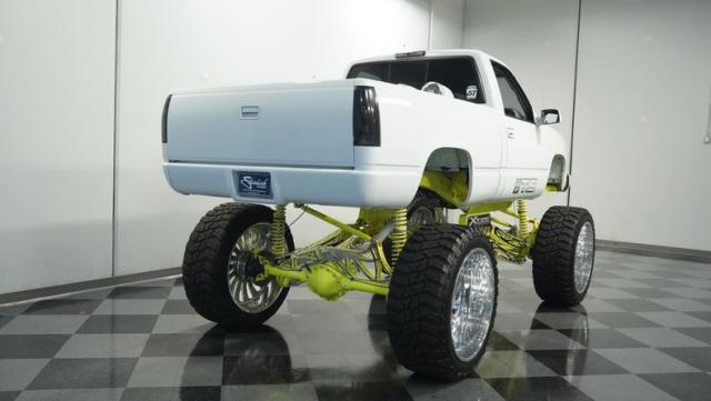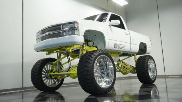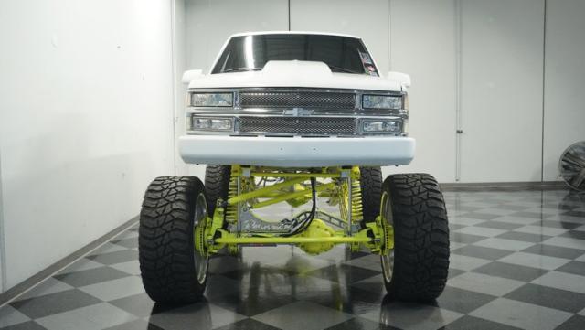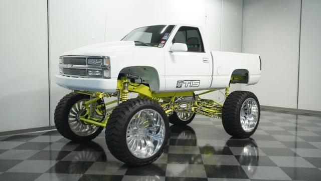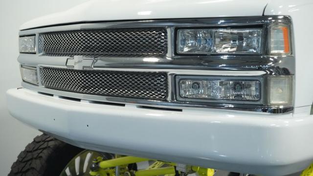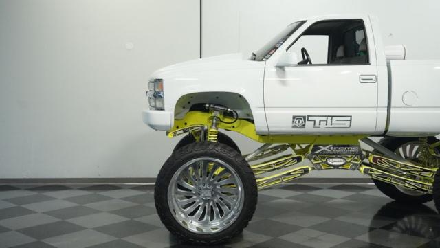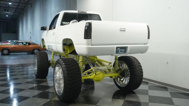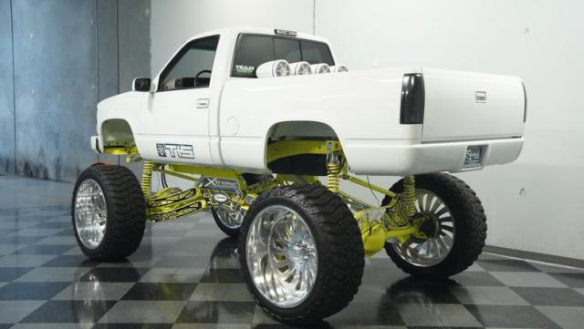 This 1997 Chevrolet K1500 4x4 made its mark at SEMA, displayed in the TIS Forged Wheels booth. The bright white paint amplifies its monumental presence, elevated by a 25-inch lift kit. The massive 30x16 TIS Forged F93 wheels with billet floater caps are wrapped in 44x16.50R30LT Venom Power MT tires. The exterior showcases a custom cowl hood, billet grille with cleared lights, smooth front bumper, and a sleek roll pan. UV rock lights illuminate the wheel wells while DS18 wake tower speakers add audio muscle to the rear.