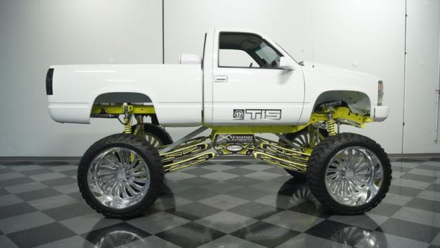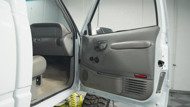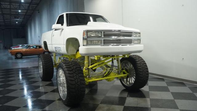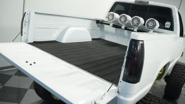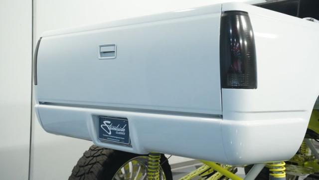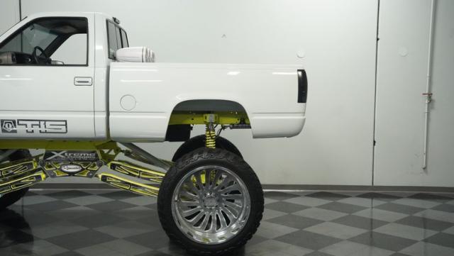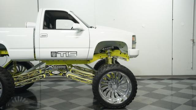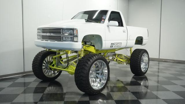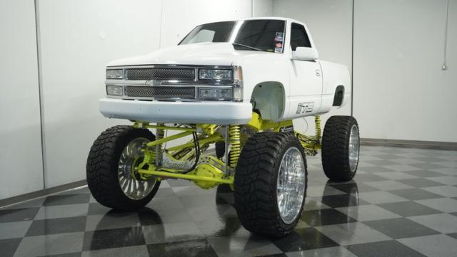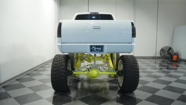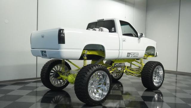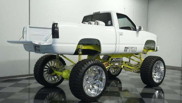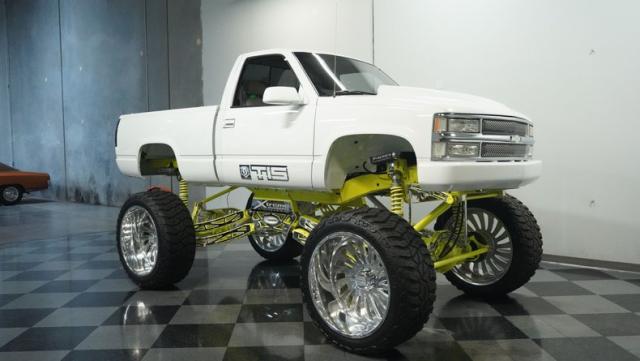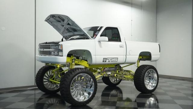 This 1997 Chevrolet K1500 4x4 made its mark at SEMA, displayed in the TIS Forged Wheels booth. The bright white paint amplifies its monumental presence, elevated by a 25-inch lift kit. The massive 30x16 TIS Forged F93 wheels with billet floater caps are wrapped in 44x16.50R30LT Venom Power MT tires. The exterior showcases a custom cowl hood, billet grille with cleared lights, smooth front bumper, and a sleek roll pan. UV rock lights illuminate the wheel wells while DS18 wake tower speakers add audio muscle to the rear.