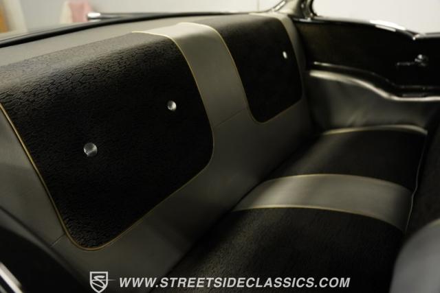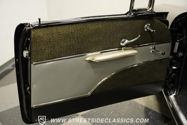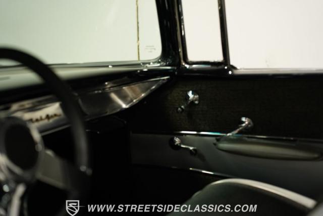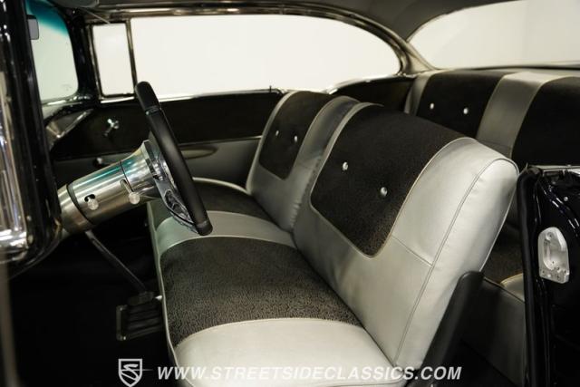 One of America\'s most celebrated Tri-Five Chevys, this 1957 Chevrolet Bel Air Hard Top comes dressed in Onyx Black with India Ivory accents. Chrome bumpers and bright work add depth to the two-tone color scheme, while the low-riding profile creates a lasting impression. Modified with a 2-inch drop in the rear, this Bel Air rolls on staggered Foose wheels - 18 inches up front and 20 inches in the rear, wrapped in 245/40ZR18 front and 275/40R20 rear tires.