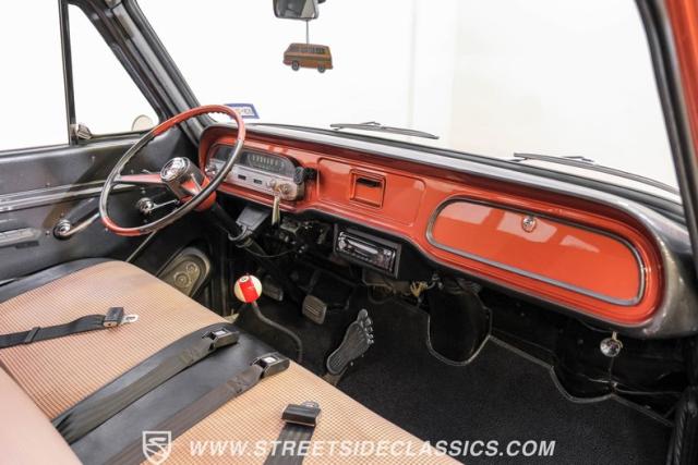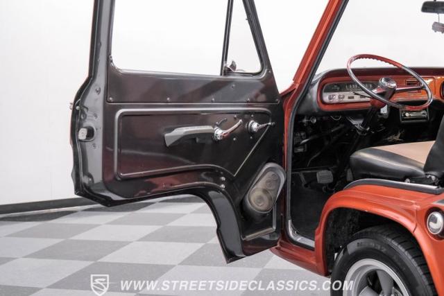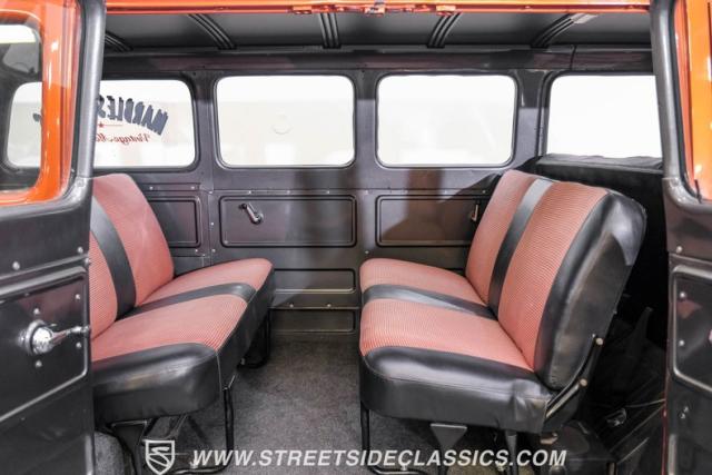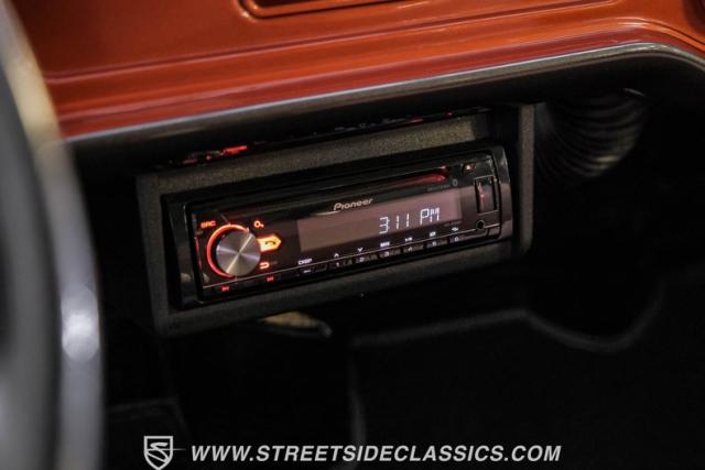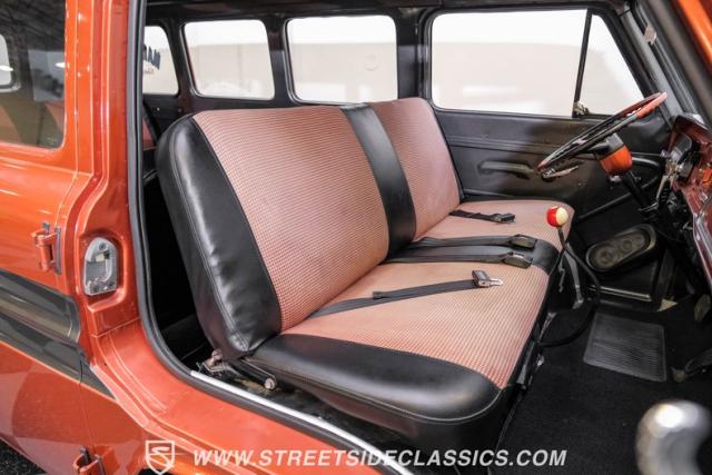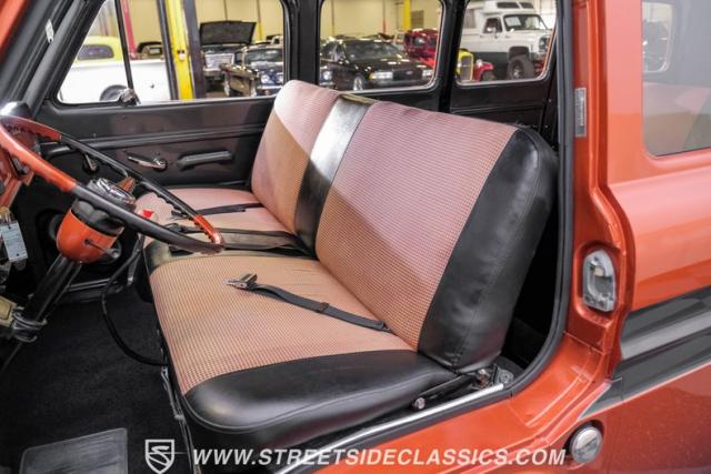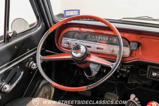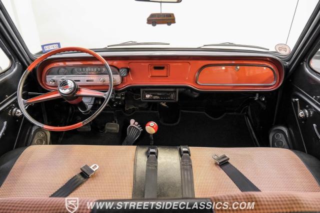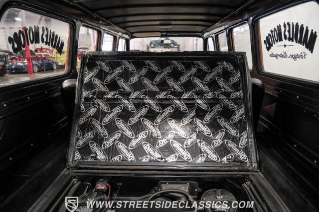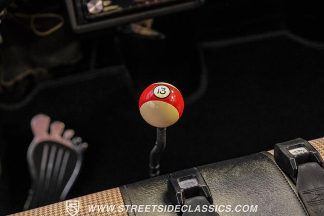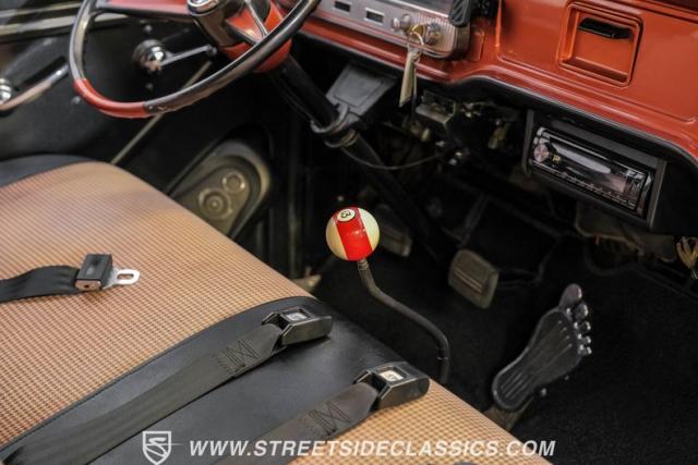 Inside, the black houndstooth interior is a perfect blend of vintage charm and modern convenience. The dual bench seats in the back face each other, inviting conversation and laughter on every journey. Up front, the bench seat is adorned with seatbelts for safety, while the 13 pool ball shifter knob adds a playful touch. The Pioneer AM/FM/CD player and speakers, along with the Kenwood subwoofer and amp, ensure that your favorite tunes will always be the soundtrack to your adventures. The painted dash and steering wheel tie the exterior colors into the cabin seamlessly, creating a cohesive and stylish space.