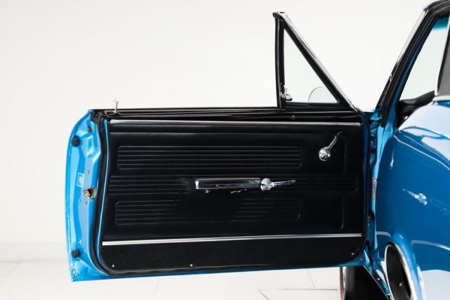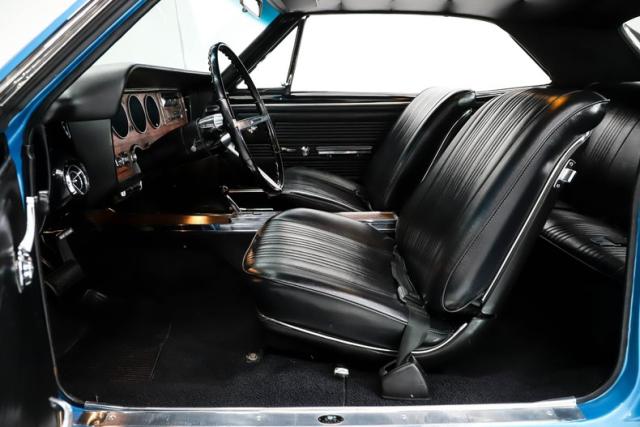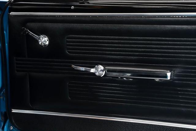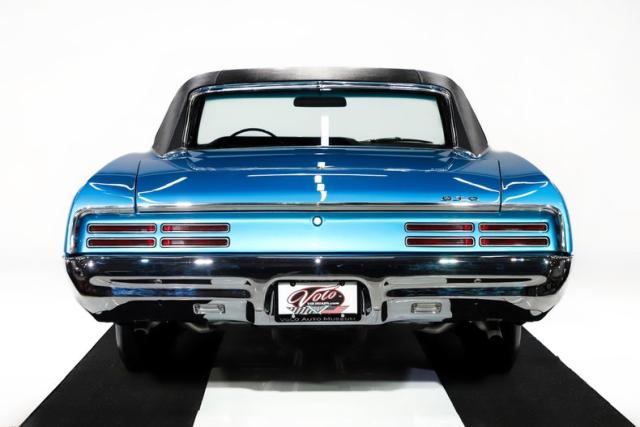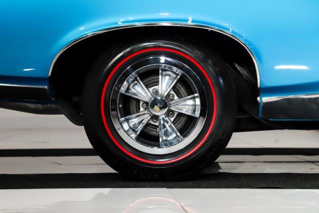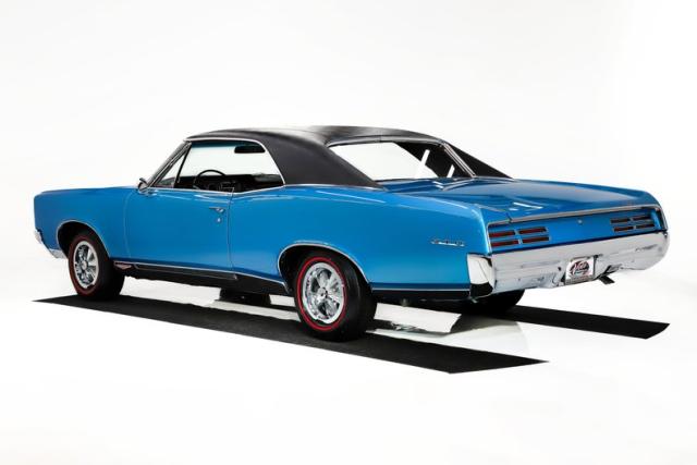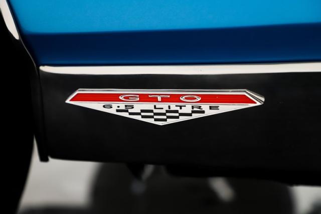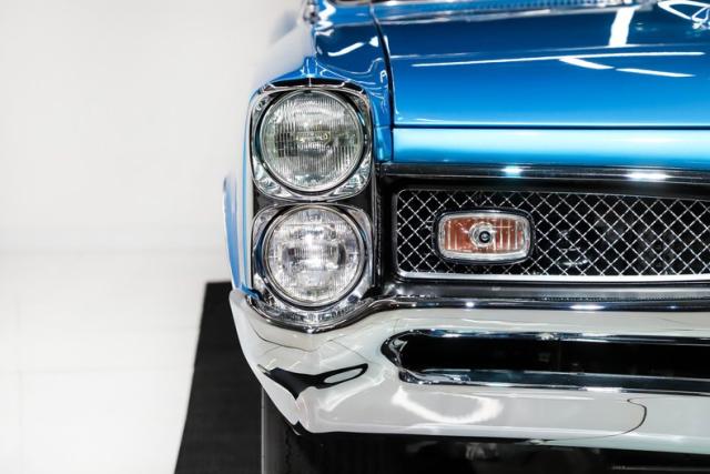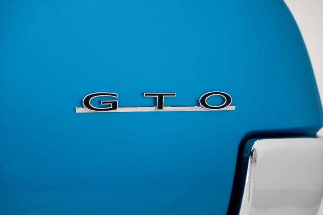 EXTERIOR: This GTO is a real stunner, and the combination of colors and wheels sets it apart immediately. The body is laser straight from front to back, including those long, dramatic Coke bottle quarter panels that define the era. I don\'t see any signs of rust or damage, and the panels line up beautifully throughout. Even the doors open and close with the solid feel of a new car. Repainted in its original Tyrol Blue, the metallic finish is laid out evenly, while the clear coat has been polished smooth as glass. All of the chrome and trim are straight, bright, and sparkle beautifully against the blue paint. The unique wire mesh grille used on the 1967 models gives the front end a distinctive and aggressive personality. The jambs are painted clean, the weatherstrips have all been replaced, and the vinyl top looks brand new. Both the front and rear glass have been replaced as well. Completing the look is a set of reproduction redline tires wrapped around vintage style Hurst wheels, a combination that absolutely puts this GTO over the top.