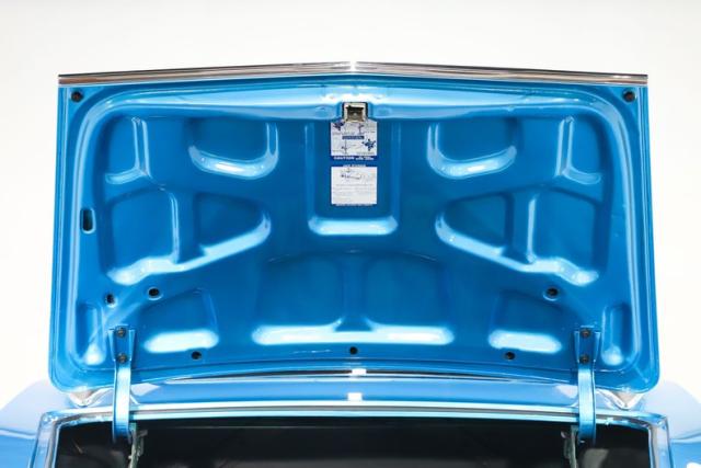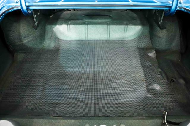 TRUNK COMPARTMENT: The underside of the trunk lid is nicely painted and detailed, complete with the proper decals, a clean latch assembly, and a neatly finished jamb area. The weatherstrip has also been replaced and the panel part numbers are still visible. Inside, the trunk features clean solid metal along with a reproduction mat and the wiring appears to have been replaced as well.