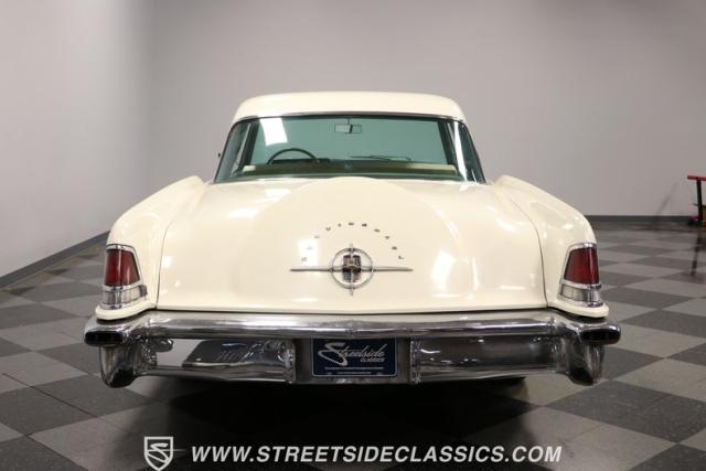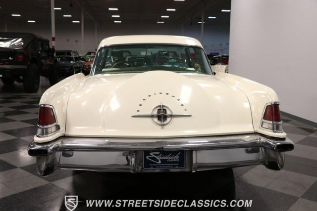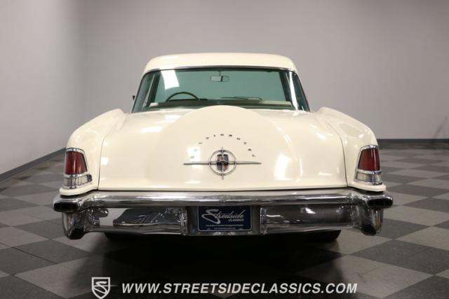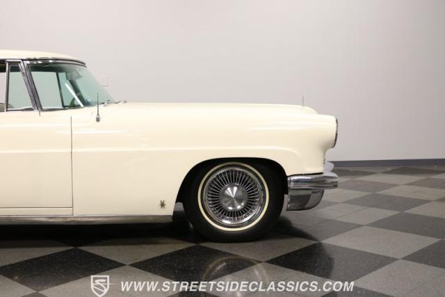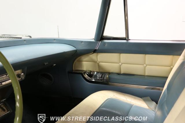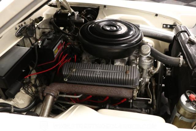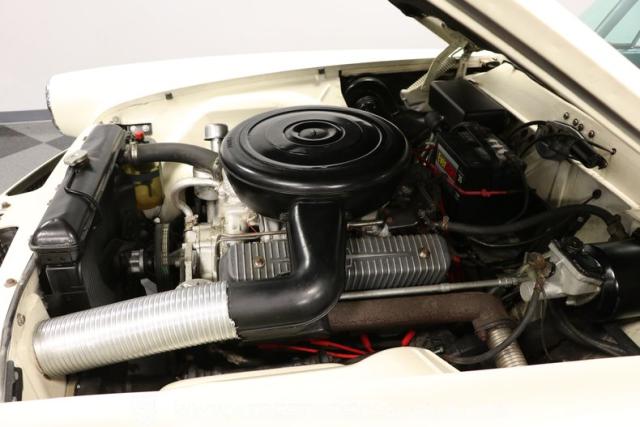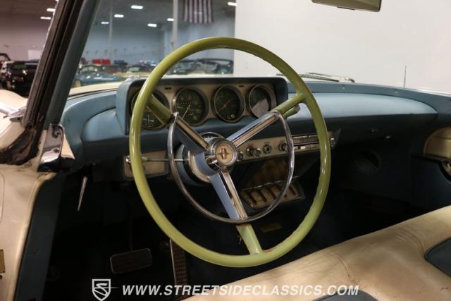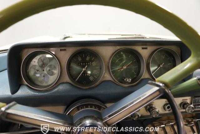 The light blue and white interior is a unique and beautiful combination that nicely coordinates with the seats, carpeting, door panels, and headliner to create a beautifully uniform appearance. It\'s hard to find anything of note that has been replaced over the decades, and we think that\'s a good thing. So while you may decide to update elements of this car, we like having plenty of originality here so you can choose what should be updated and what should represent the Eisenhower administration. The instrument panel was influenced by both aircraft and clocks. It has wonderfully detailed dials and levers for the heater controls, making for a unique driving experience. Beyond the intricate factory wheel is a full gauge panel with a tachometer. It\'s a highly original presentation with terrific luxuries for its era, like the AM radio and a power seat.