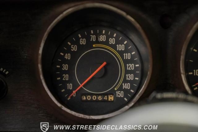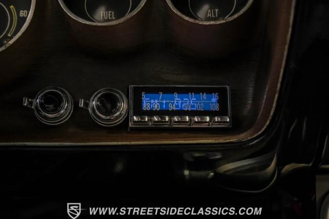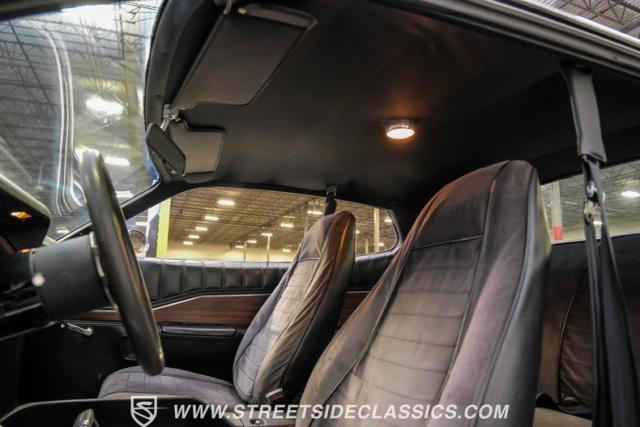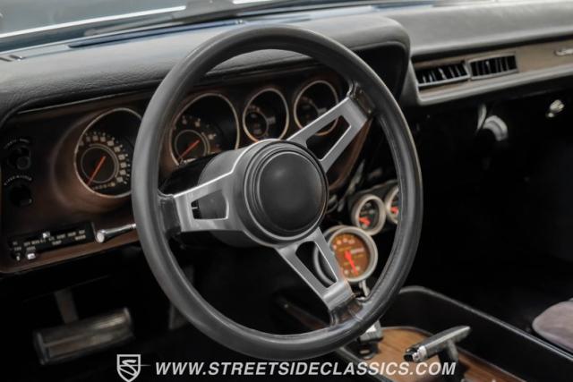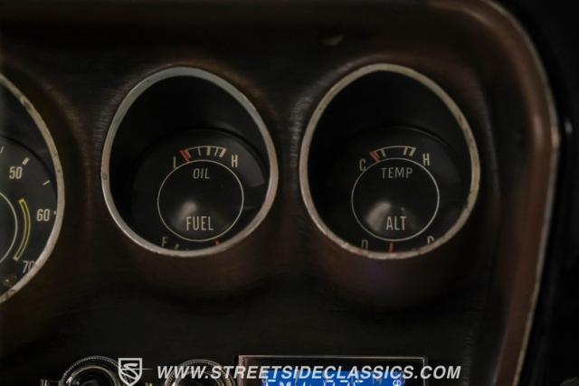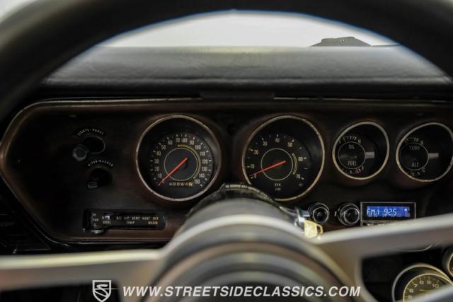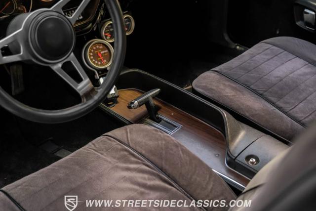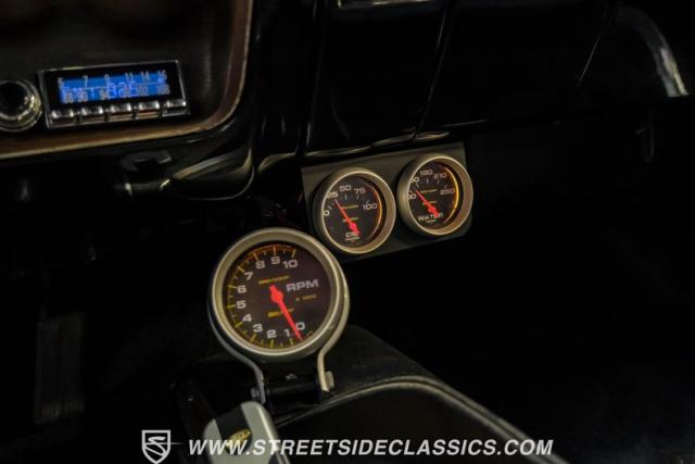 The black interior matches the car\'s powerful exterior. Bucket seats, upholstered in vinyl and cloth, offer both comfort and period-correct style. A floor shifter and center console put control at the driver\'s fingertips, while additional under-dash gauges and a tachometer provide crucial performance data. The updated retro-style radio bridges vintage aesthetics and modern sound quality, complemented by a clean black vinyl headliner.