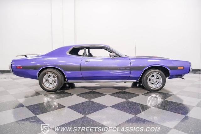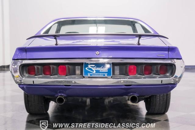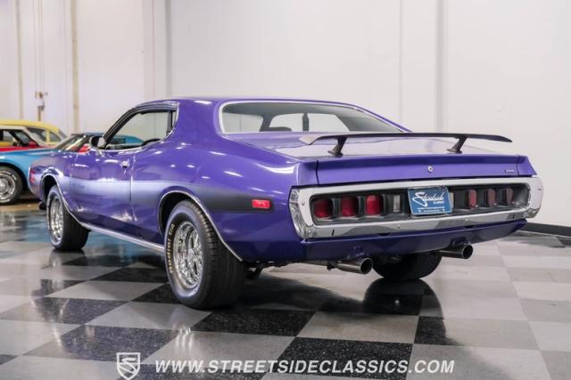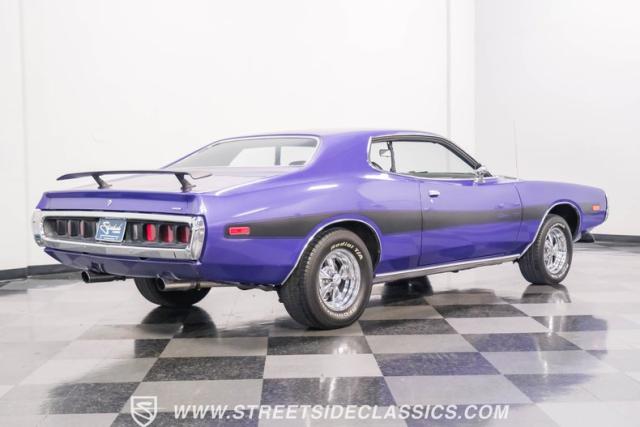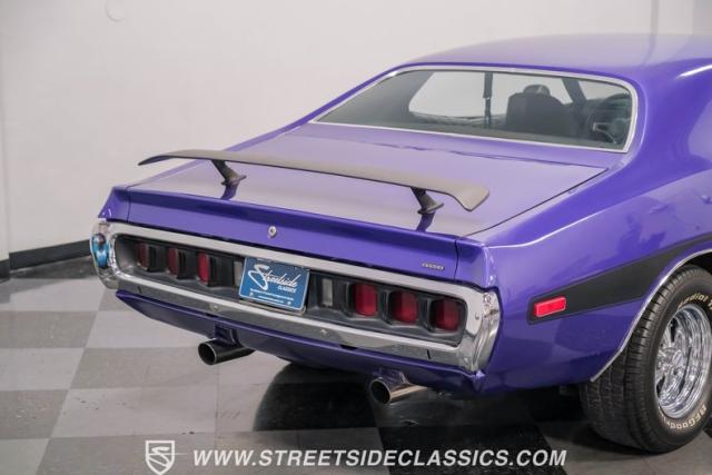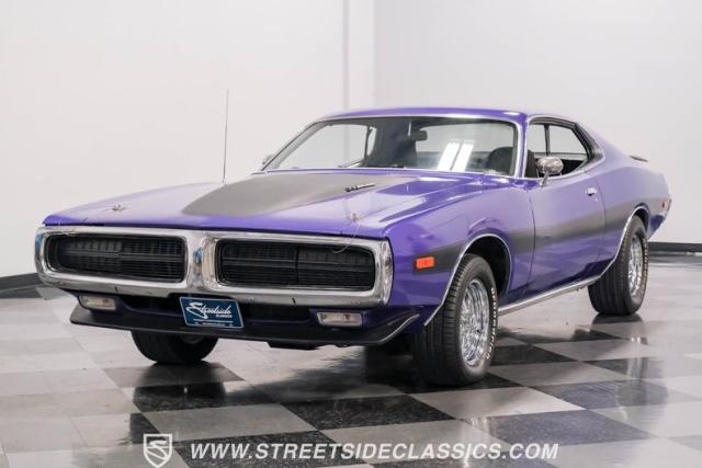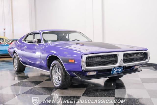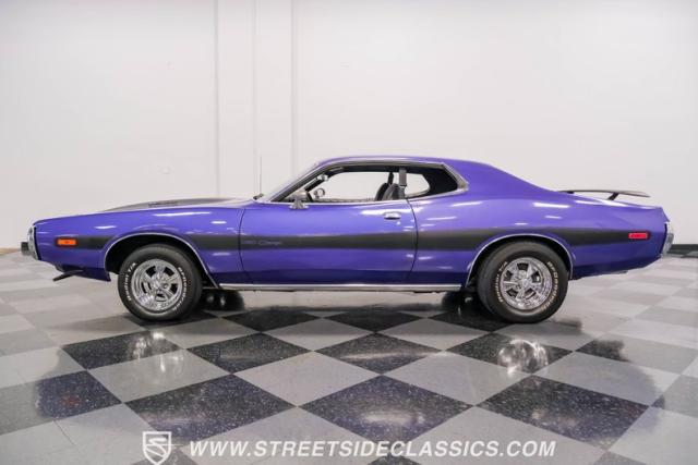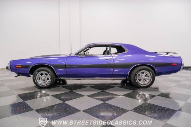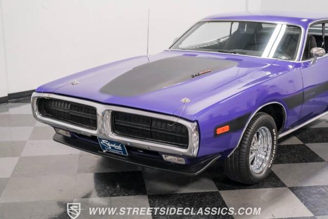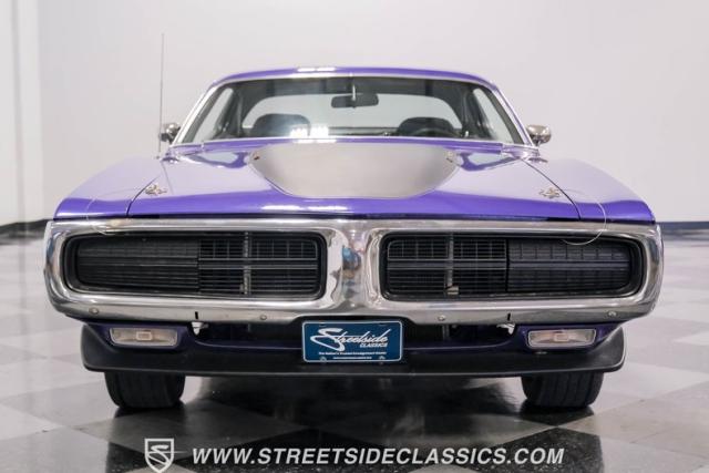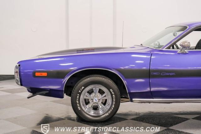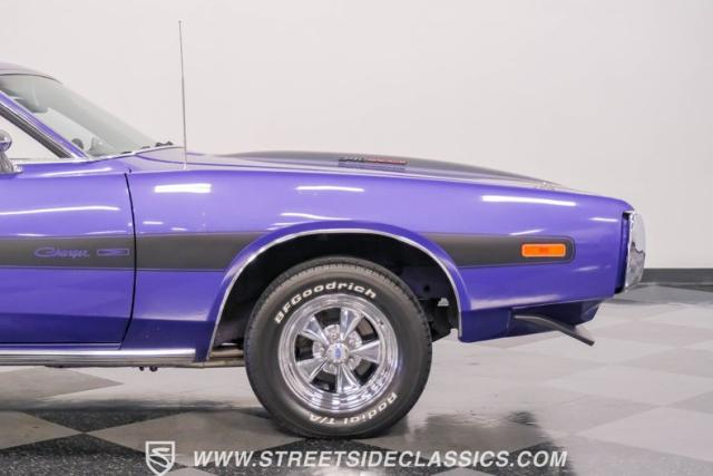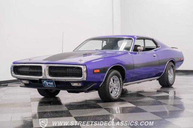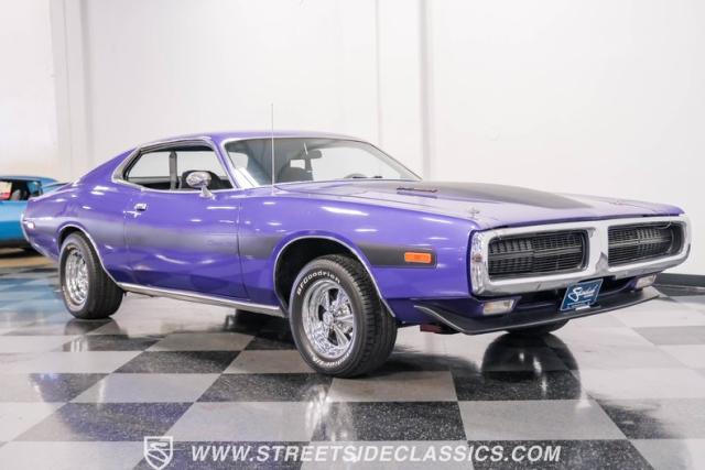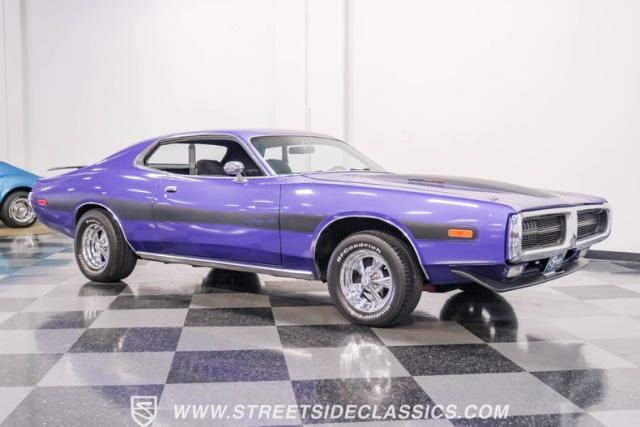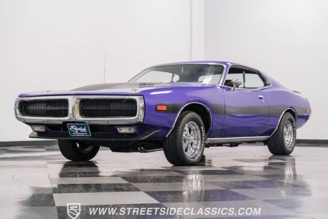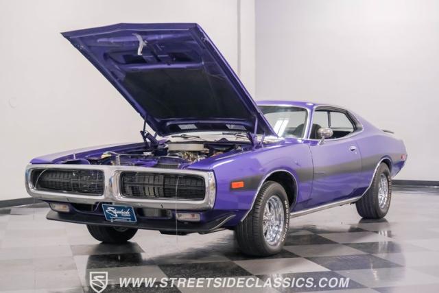 This 1974 Dodge Charger showcases a Plum Crazy Purple exterior that\'s impossible to ignore. It\'s a unique fusion of Mopar\'s best design elements, sporting a hidden headlight front end from \'71-\'72 and a \'71 R/T style tail light package. The aggressive profile is enhanced by 15\" Cragar wheels, fitted with beefy 235/60R15 front and 275/60R15 rear BFGoodrich tires. Black stripes cut through the vibrant purple paint, amplifying this Charger\'s muscular presence on the road.