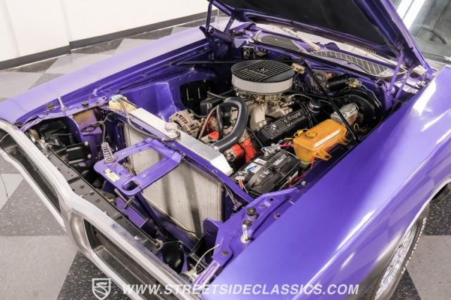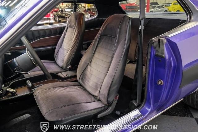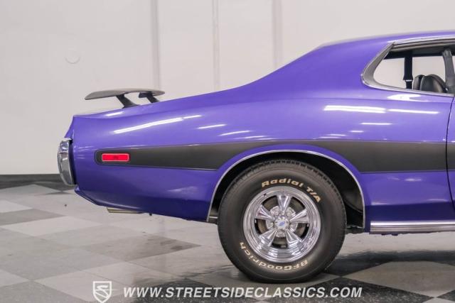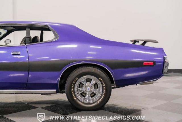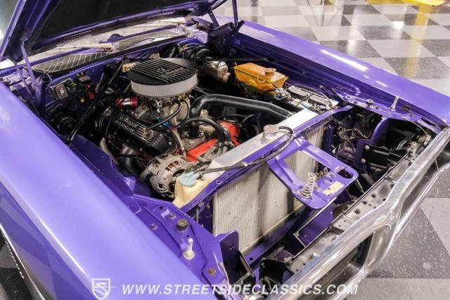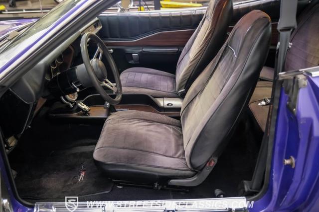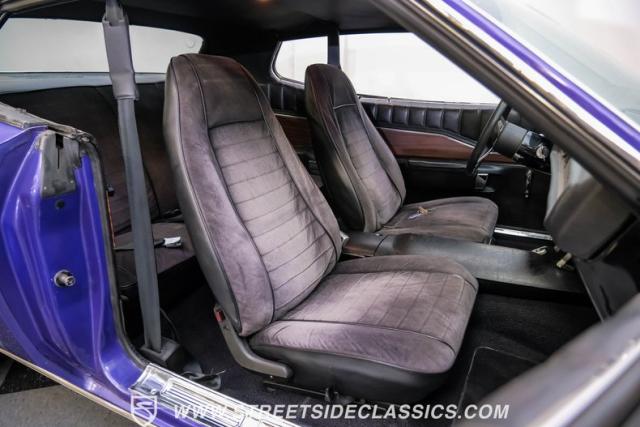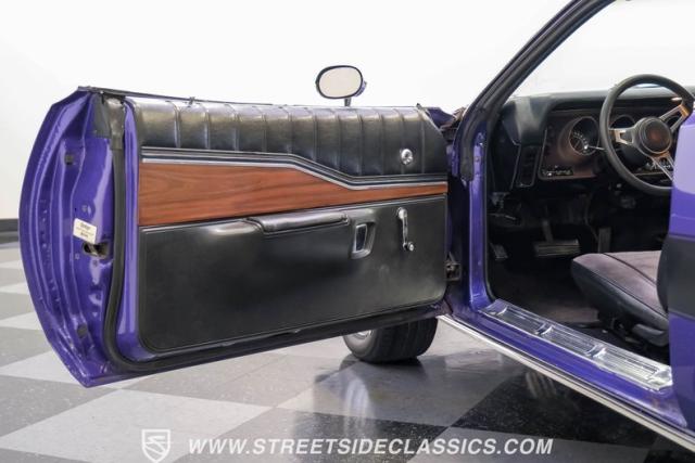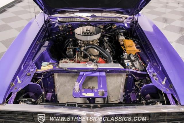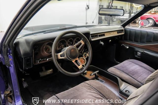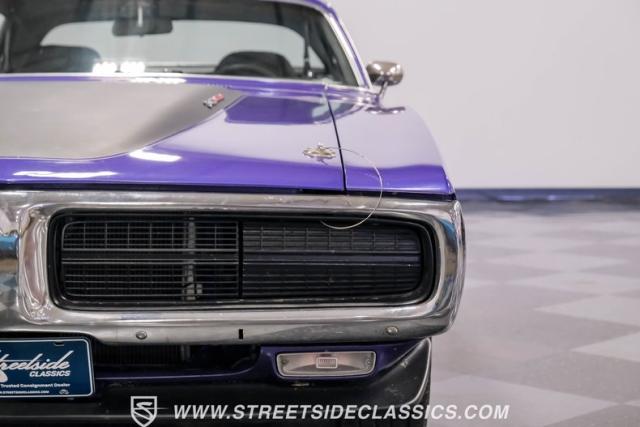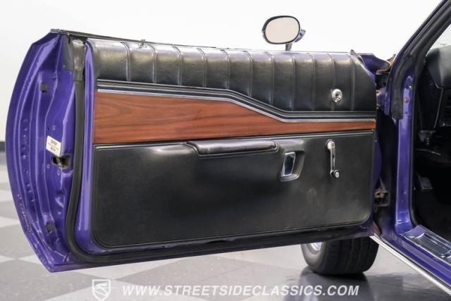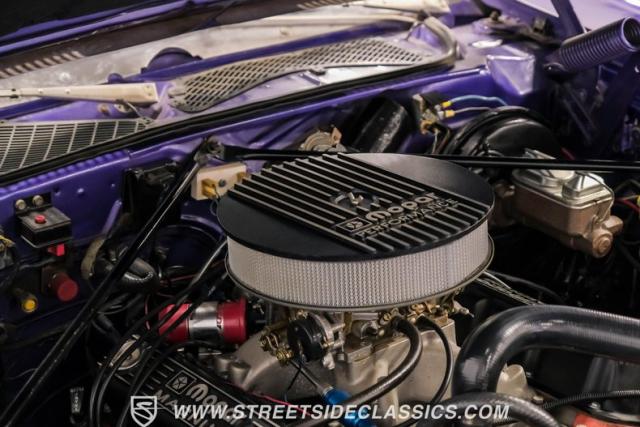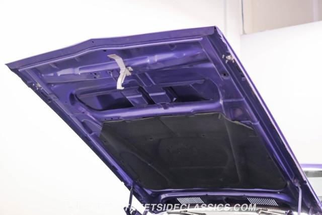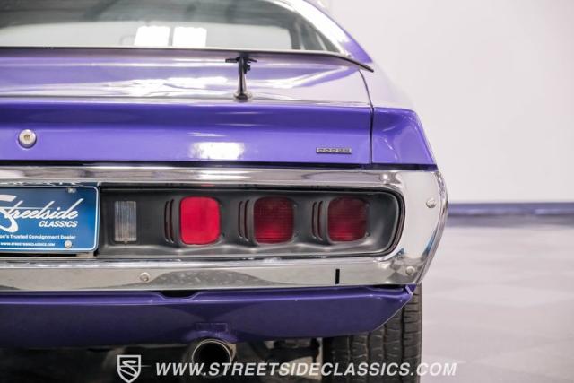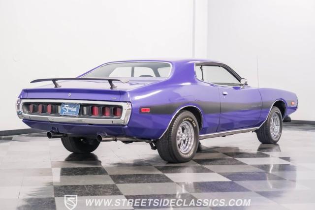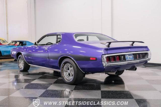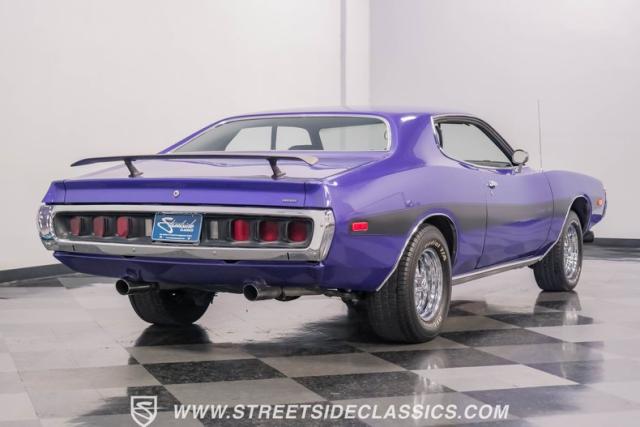 This 1974 Dodge Charger showcases a Plum Crazy Purple exterior that\'s impossible to ignore. It\'s a unique fusion of Mopar\'s best design elements, sporting a hidden headlight front end from \'71-\'72 and a \'71 R/T style tail light package. The aggressive profile is enhanced by 15\" Cragar wheels, fitted with beefy 235/60R15 front and 275/60R15 rear BFGoodrich tires. Black stripes cut through the vibrant purple paint, amplifying this Charger\'s muscular presence on the road.