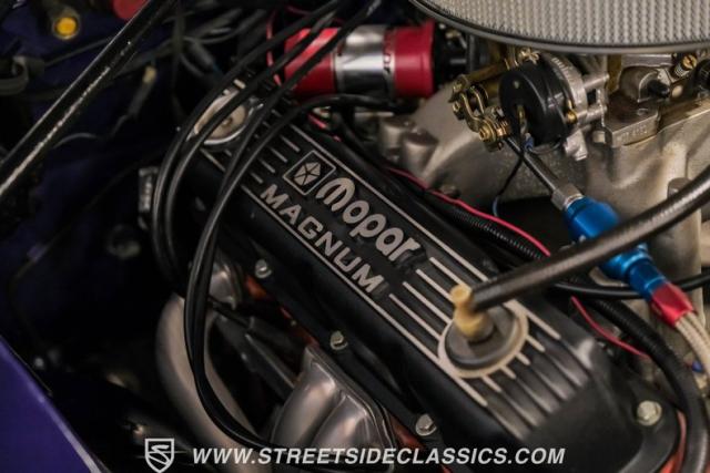 Open the hood to reveal a 408 stroker V8 with 9.7:1 compression. This powerplant breathes through Indy Iron Max heads with oversized valves and a hydraulic roller cam. Fuel management is handled by an Edelbrock 750 CFM carburetor sitting atop a Mopar Performance intake. Power flows through an A727 Torqueflite 3-speed automatic transmission, equipped with a B&M converter featuring a 2,500 RPM stall, to the 8 3/4\" rear end with 3.23 gears. Long tube headers feeding into a dual Flowmaster exhaust system produce a signature muscle car rumble.