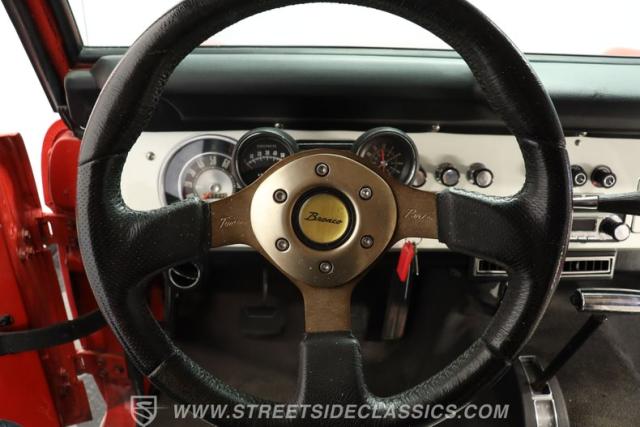 Some serious attention was focused on the interior, paying dividends in the form of a pair of white vinyl-clad bucket seats that are in clean condition, and a dash area that arguably looks as good as when this Bronco rolled off the assembly line more than half a century ago. A pair of Rally Pack gauges is mounted on the steering wheel, accompanying the set recessed into the instrument cluster, and the aftermarket steering wheel, along with a retro-sound AM/FM stereo with Bluetooth connectivity, is one of the few deviations from a thoroughly stock appearance, yet actually complements its surrounding components really well. A less visually obvious but welcome upgrade would be the compressor that accommodates the modern R134 refrigerant now coursing through the air conditioning system to provide year-round comfort.