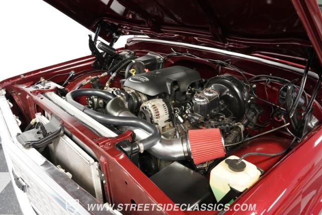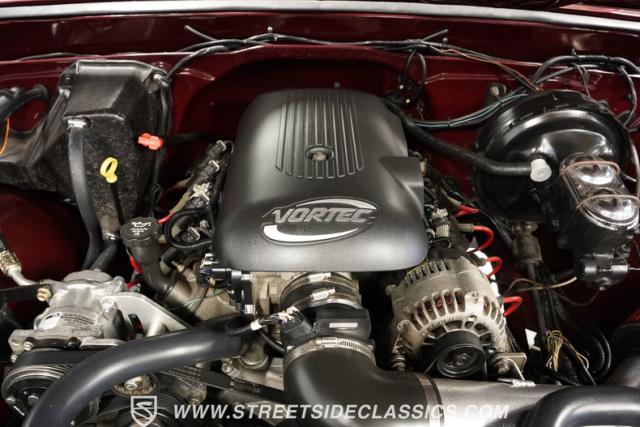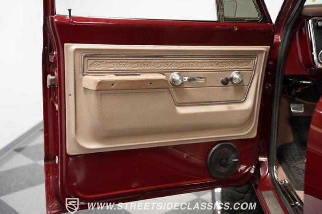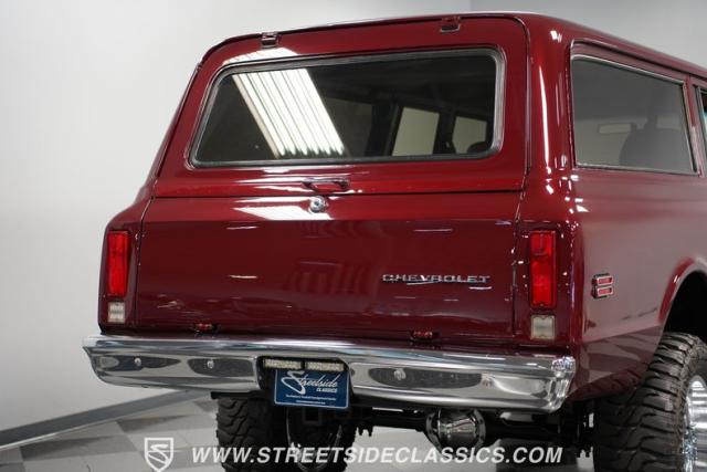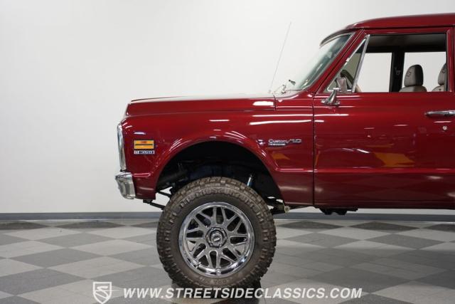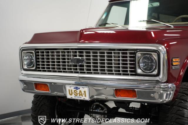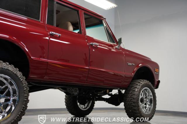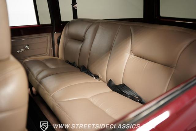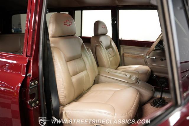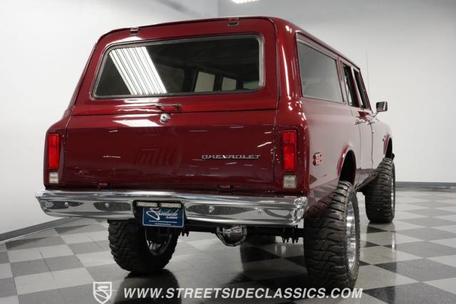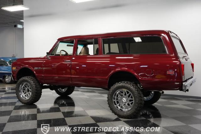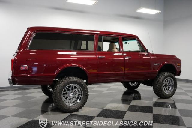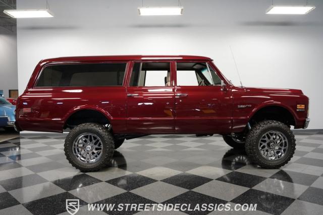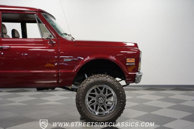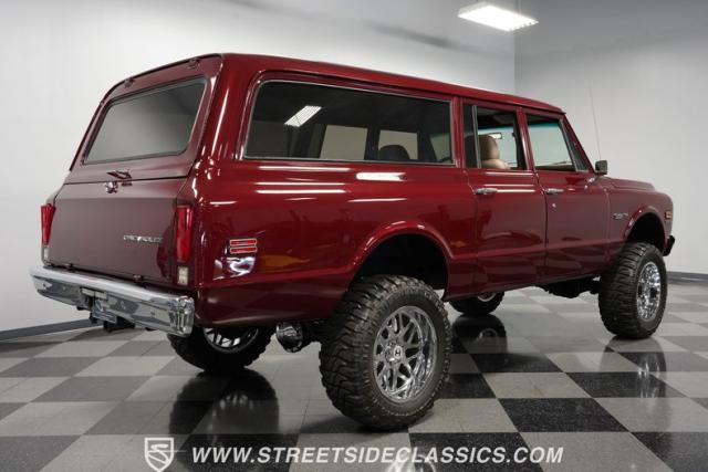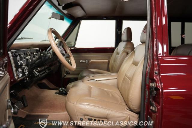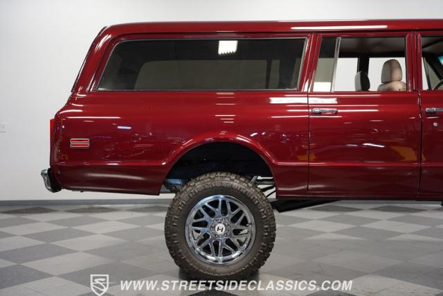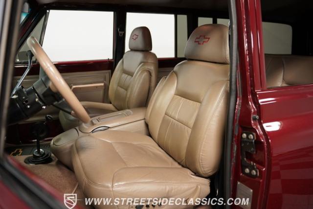 This 1972 Chevrolet Suburban 4X4 Restomod transforms a classic workhorse into a modern powerhouse. Its muscular body is gleaming with Burgundy Metallic paint, perfectly complemented by 20-inch Hostile wheels wrapped in massive 35x12.50R20LT tires. A frame-off restoration has given this Suburban new life, blending vintage appeal with contemporary performance. The upgraded LED headlights and license plate illumination add a touch of modern flair, making this SUV stand out on any road.