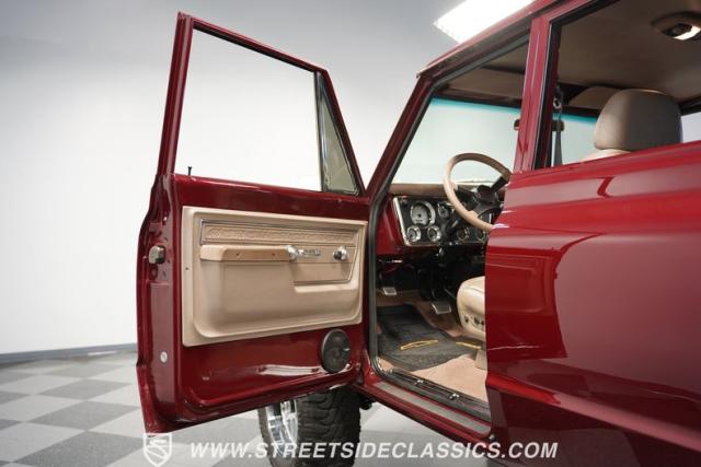 Inside, the beige leather interior offers a luxurious contrast to the rugged exterior. Late model electric driver\'s seat provides comfort for long hauls, while the custom console adds convenience and style. The Dakota Digital gauge cluster brings a high-tech edge to the classic dashboard. Both front and rear air conditioning systems ensure all passengers stay comfortable, no matter the weather outside. An AM/FM single CD player provides the tunes for your adventures, all encased in a clean, well-crafted interior that\'s been meticulously restored.
