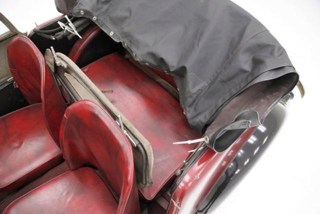 Flip open either door and gaze around at your passenger compartment where you\'ll see a wonderfully curved dual hump designed dash draped in aged walnut veneer with just a hint of maroon aluminum riding the wave of the top edge. A center mounted ignition/headlamp switch and choke pull is flanked by the instrument to the left and an open glovebox to the right. Fronting the curvaceous dash is the original steering wheel in full banjo style, presenting with a black leatherette cover and chromed ribs. Smooth oxblood marbled vinyl lowback bomber style bucket seats show little to no wear and have the convenience of a full back and individual bucket seats. The door panels are in black and are in just as good of shape as the seats, all nice. Red carpet covers the rear section of the floors and console as well as a small storage area behind the seats and under the convertible top stowage. The front floors are red painted sturdy wood...smashing baby!