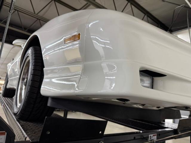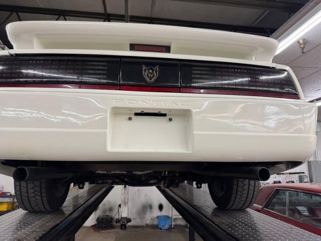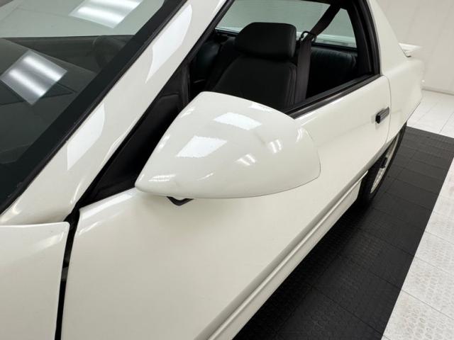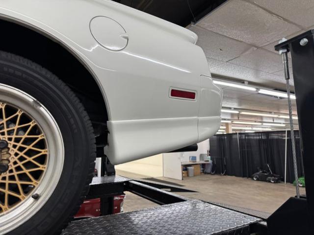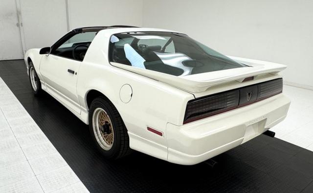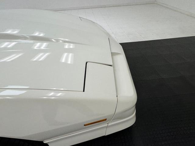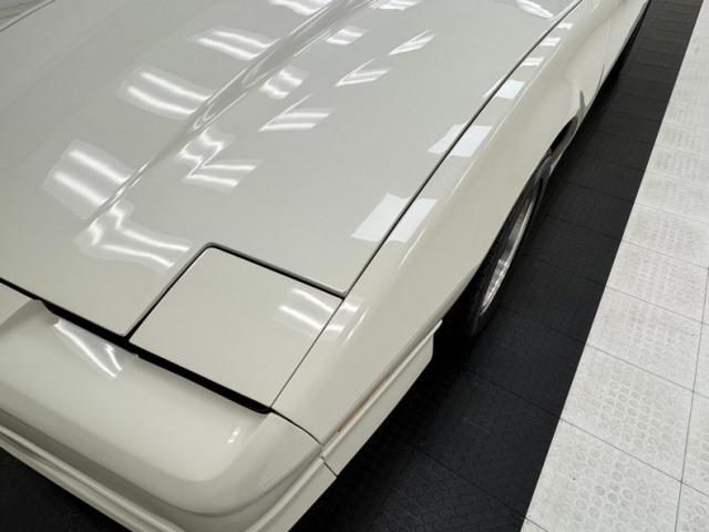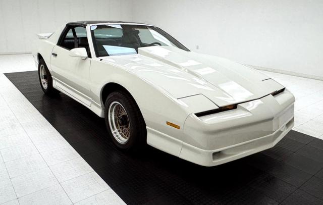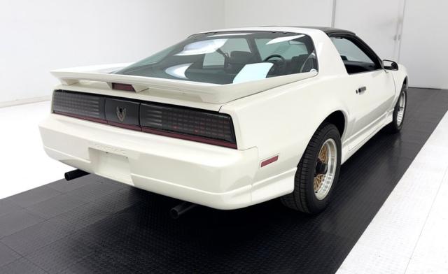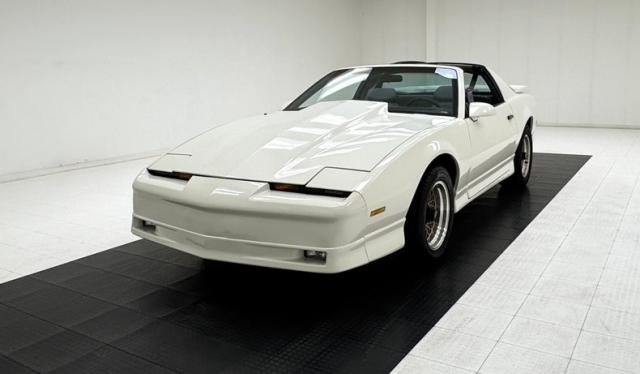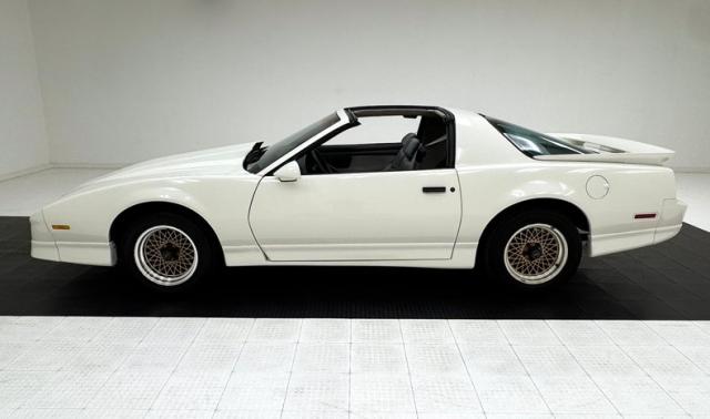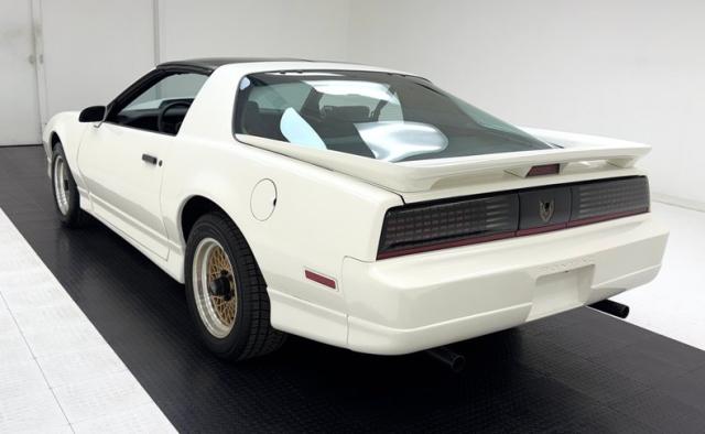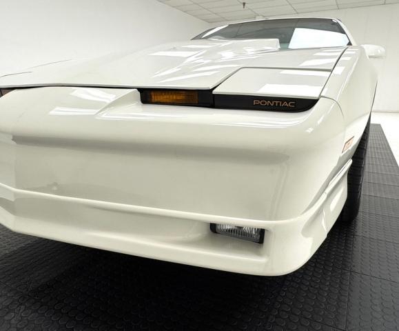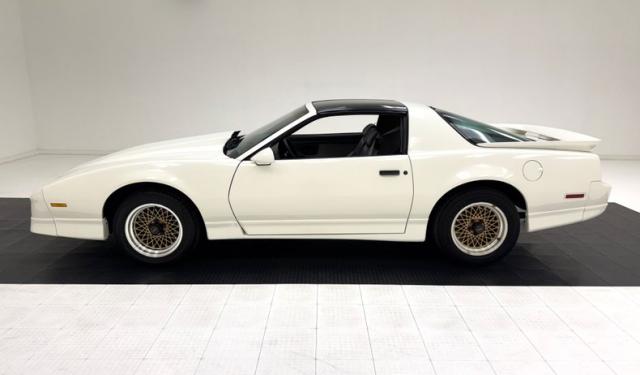 White as the driven snow and badgeless, this clean, wedge shaped F-body is a now classic design. The lace design wheels were so unique to the line, they became known as GTA wheels, offset in gold and carrying slightly staggered width tires. Translucent, smoked T-tops give the cockpit a fuselage-like profile and this car sports a cowl hood for a little extra muscle that balances the rear wing, while body cladding creates a lower profile. This generation continues Pontiac\'s tradition of trend setting tail lights and distinctive lightbar. A repaint has held up wells, and imperfections noted include various scratches, areas of thin paint, some delamination of clear on the wheels, inclusions in the paint, paint runs, chin scrapes, and minor cracked cladding.