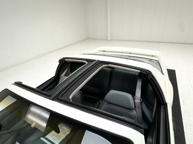 Gray cloth inserts live inside the gray vinyl door panels, showing a touch of age here, especially the driver\'s side that shows a tear and some age through staining. The leather buckets and rear 2+2 seating remains in very good shape and in front, a Grant GT steering wheel replaces the stock unit and leads to the slightly weathered but always cool 80\'s instrument cluster in a gray plastic faceplate and leather map pocket where the glove box would be. An aftermarket AM/FM/CD is in the center console along with the standard A/C panel leading to a center console holdinga T-handle shifter in a grid adorned flat faceplate. Our gray carpet shows some slight aging and T/A mats take the brunt of the workload and the hatch area has a contoured area for the T-tops.
