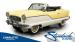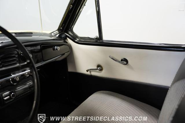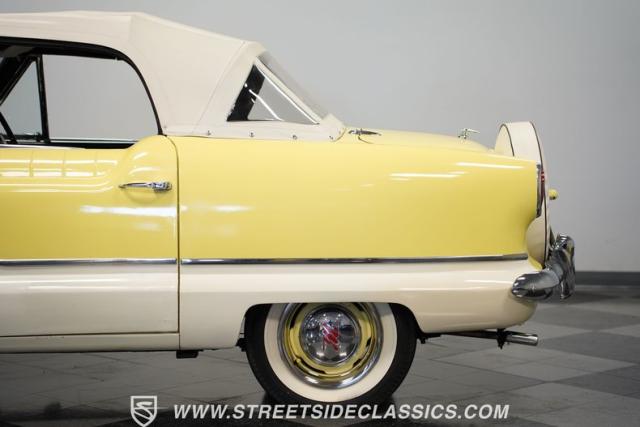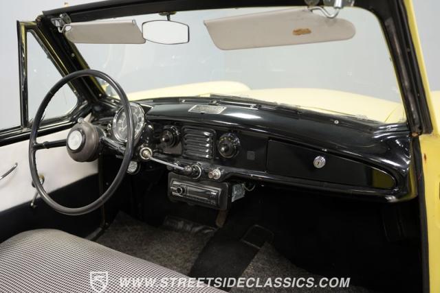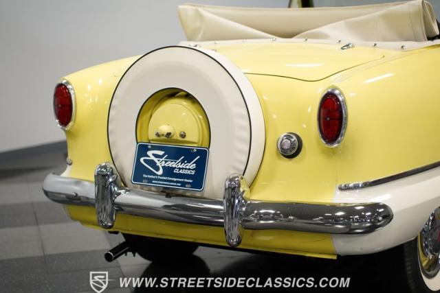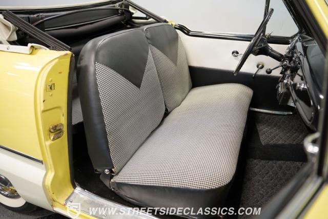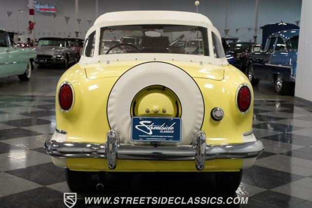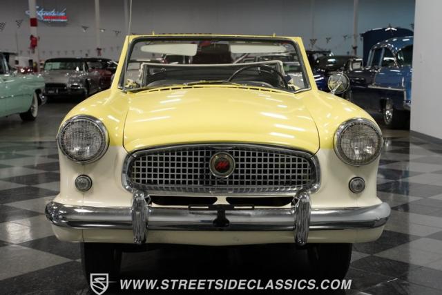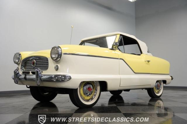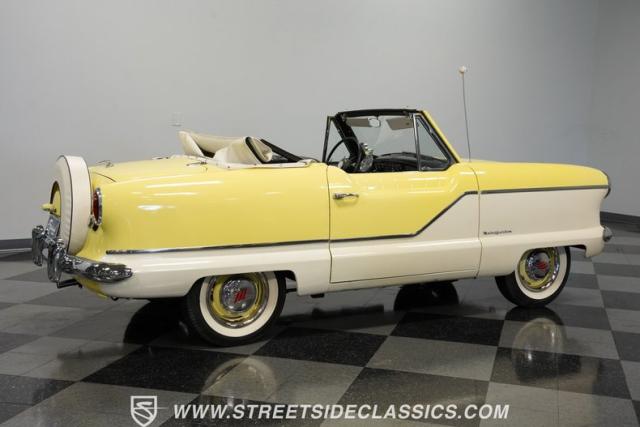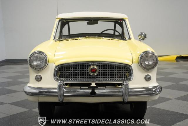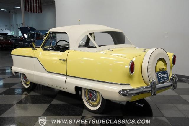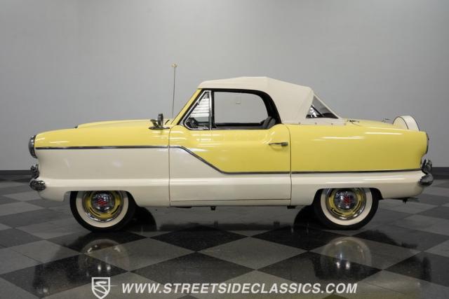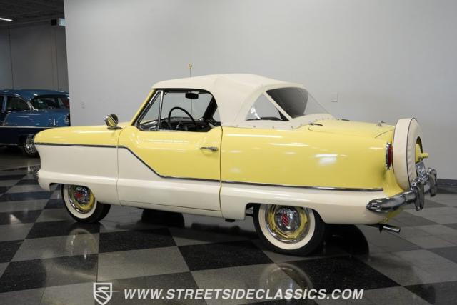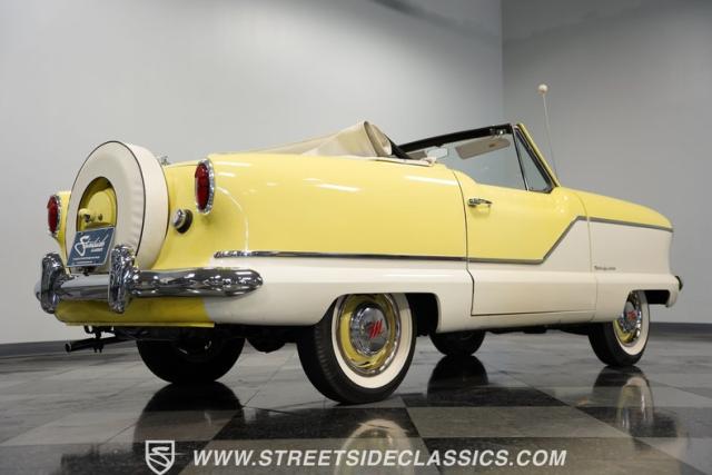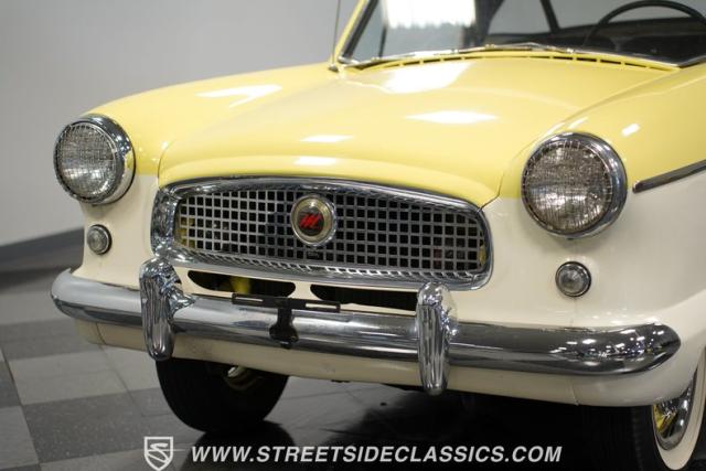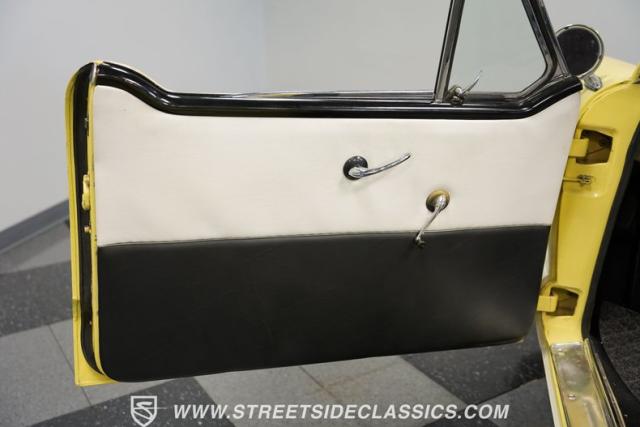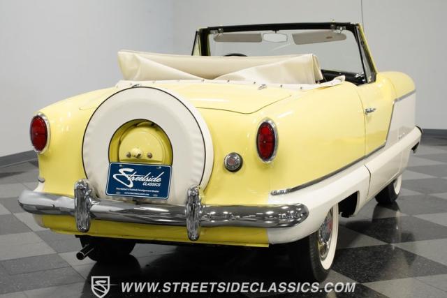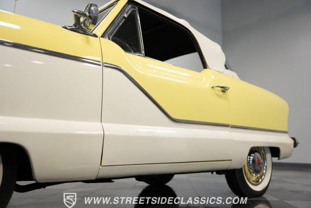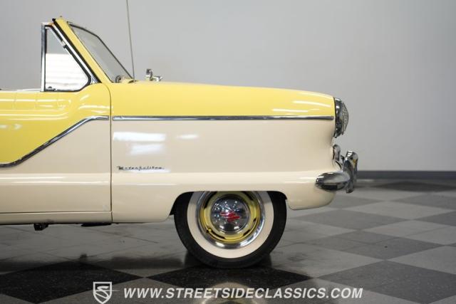 This 1959 Metropolitan 1500 Convertible showcases American Motors Corporation\'s foray into the microcar market. With its distinctive two-tone paint scheme and compact dimensions, this yellow roadster embodies the quirky charm of 1950s automotive design. The white vinyl convertible top provides a stark contrast against the sunny yellow body, while classic stone screens protect the headlights. Rolling on 13-inch wheels wrapped in 5.60-13 tires, this Metro\'s stance is cute and purposeful. The continental kit on the rear adds a touch of luxury to this diminutive cruiser.