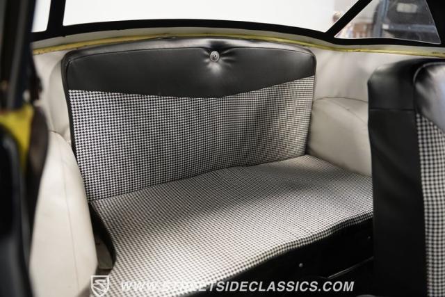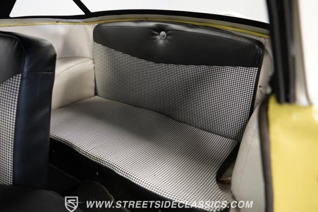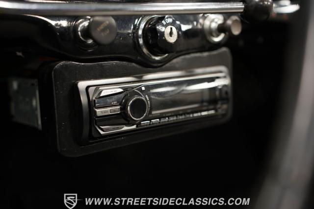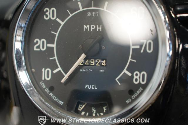 Inside, the black and white interior mirrors the exterior\'s playful aesthetic. Vinyl and cloth split-bench seats offer a comfortable perch for two. The dash paint shines in good condition, complementing a pristine Smith gauge. An AM/FM single CD player with USB input allows modern connectivity in this vintage package. The steering wheel, adorned with a few character lines, frames the simple yet functional controls. Door panels remain solid, except for minor wear near the convertible top mechanism.