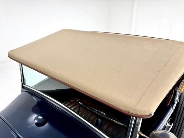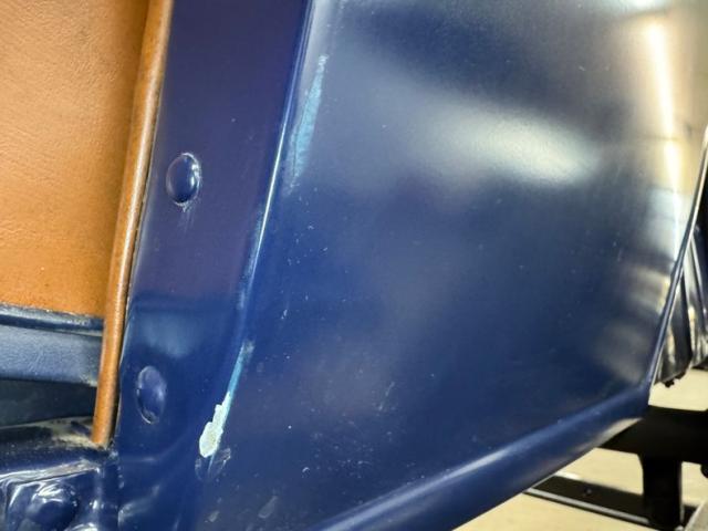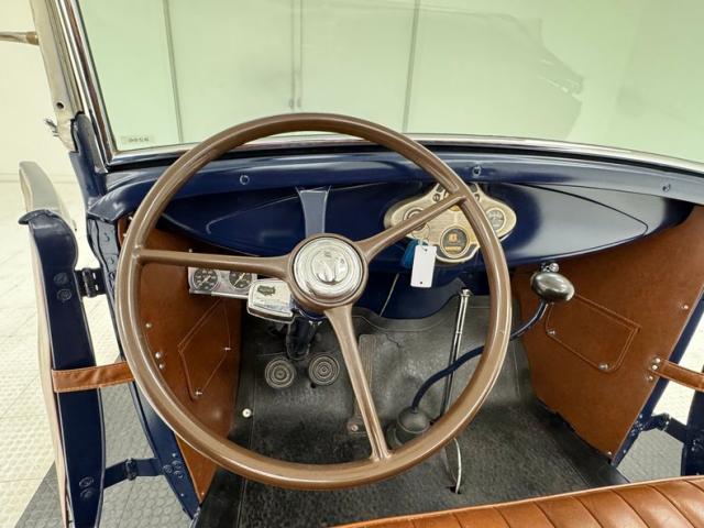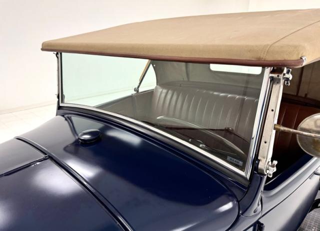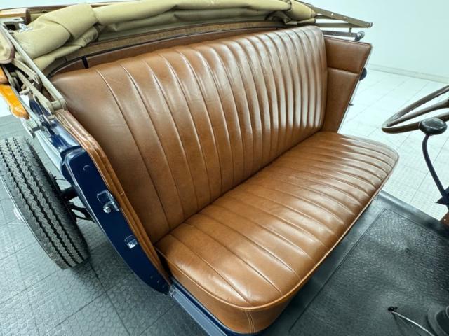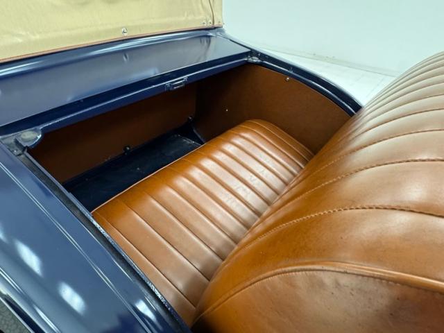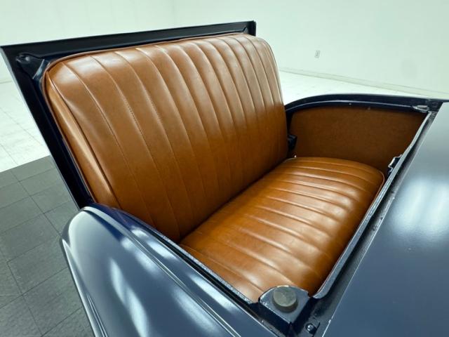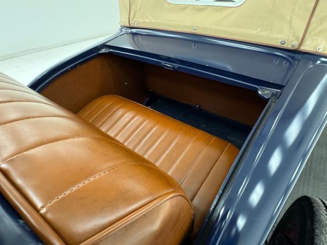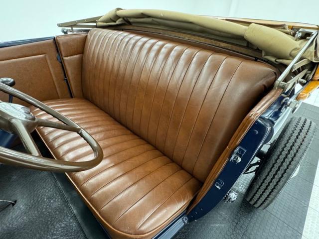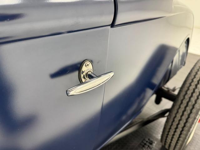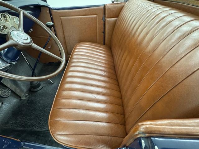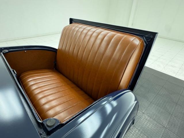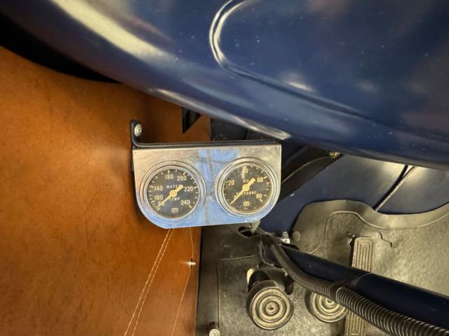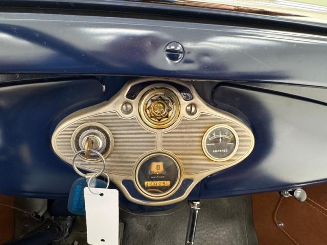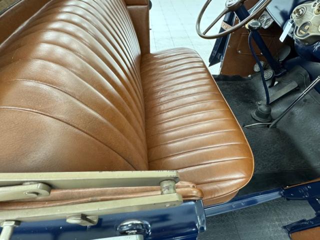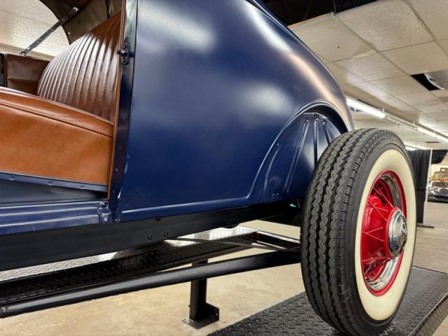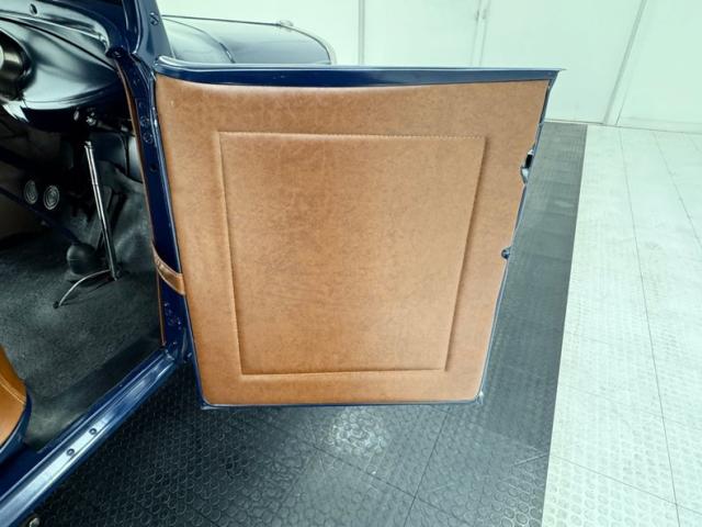 A LeBaron Bonney interior has been applied, here in saddle brown vinyl which covers the inner doors and pleated bench seat as well as sidewalls, footwells, and hideaway rumble seat. A stunning 3 spoke steering wheel fronts the body colored dash board with the vintage gauge cluster in center showing appropriate patina, and some added Stewart Warner units mounted on the side. A fitted and textured rubber mat covers the floor, surrounding the blue painted shifter and polished handbrake.