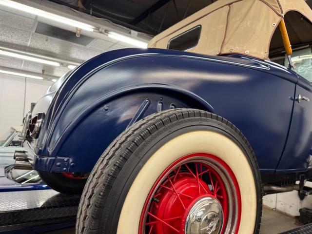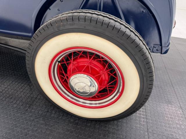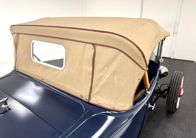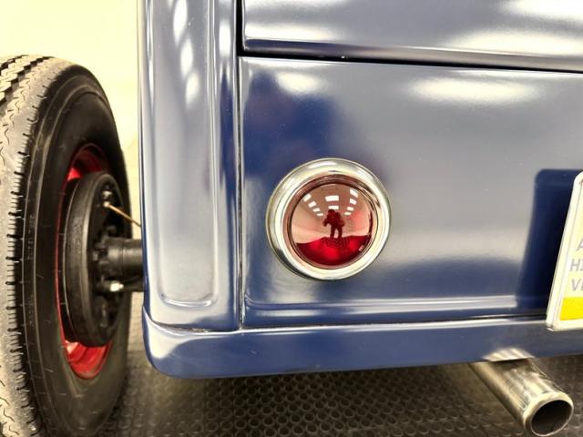 The quintessential hot rod, with open wheels, non glossy paint, and a roadster profile, this one starts with starts with satin dark blue paint over the fenderless body and when combined with 16-inch red wire wheels from a 1935 Ford, it gets a thumbs up for all who gaze upon it! The wide white walls help as does the visible flathead also painted red. Around back, the lines are clean and panels smooth, accented with tail lights from a 1950 Pontiac in symmetry with the two straight exhaust pipes that project under the apron. The front is tasty too with lowered headlights and clean black linkage and axle under the ideal grille surround. A tan canvas top is like icing on the cake and connects to the vertical windscreen and houses a small, glass rear window. Imperfections are limited to a single paint chip and single scratch.