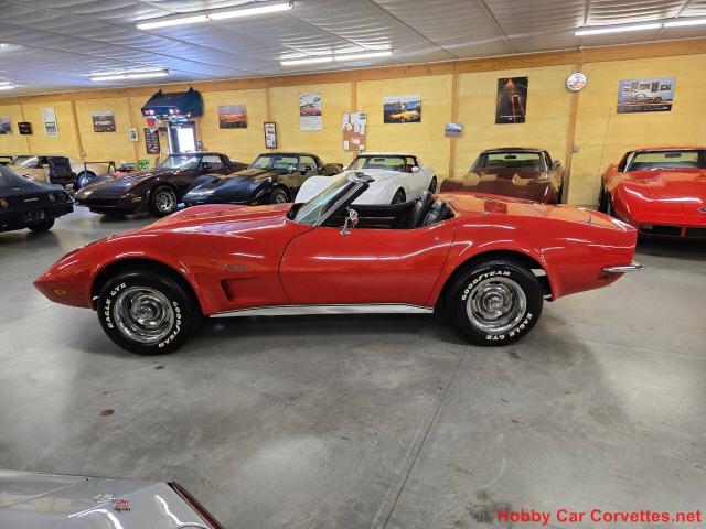 1973 Red Corvette Convertible For more information visit: https://www.hobbycarcorvettes.net/corvette/1973-red-corvette-convertible/ CASH PRICE: $ 30000 Transmission: Automatic Engine: 350 Mileage: 40768 on dash Details 350 engine, automatic transmission, 40,768 miles on dash (title is exempt for mileage), same owner for the last 12+ years, rally wheels, black leather interior, black convertible top, AM/FM/CD Player, power steering, power brakes, X-A/C, dual exhaust, fiberglass front bumper, and much more. We changed the oil and filter, transmission fluid and filter, and checked and lubed the chassis. We replaced the upper and lower control arm bushings, upper and lower ball joints, front shocks, motor mounts, water pump, temperature sending unit, sway bar links, gas tank, gas tank sending unit, spark plugs, spark plug wires, power steering pump, power steering control valve, power steering hoses, distributor, rear shocks, and much more. 1973 marked the end of the chrome bumper corvette era with rear chrome bumpers going away in 1974 and being replaced by rubber bumpers. The 1973 was a one-year-only body design. GM also did away with the vacuum operated wiper door this year, in favor of a longer hood to hide the wipers, and dropped the removable back window in favor of a glue-in window.