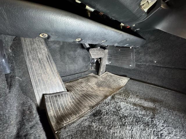 General patina and road dust colors the underside but we\'re not seeing surface rust worth mentioning and only some residual oil on the front splash guard. Power disc brakes are employed at all four wheels and dual exhaust run to a stock style muffler in back that emits a dual tailpipe shrouded in an oval tip. Suspension consists of double wishbones up front and coil overs in the independent rear system.