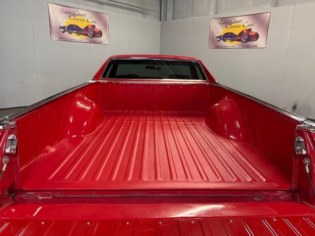 The interior is black on bucket seats, door panels, arm rest, kick panels, door handles, window cranks, tilt column, original type steering wheel 3-post, horn button, dash pad, black dash cluster, all factory gauges and tach, aftermarket AM/FM/Aux in correct place in the dash. A/C & heater control system, all dash knobs, A/C vents, console with Muncie 4-speed shifter, pedal pads, black carpeted floor mats embroidered with El Camino. Headliner, Sunvisor’s, overhead light, rear view mirror are all like new. Looks new inside.