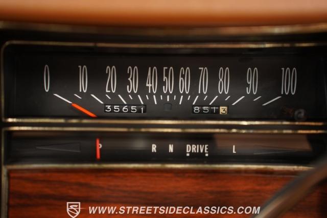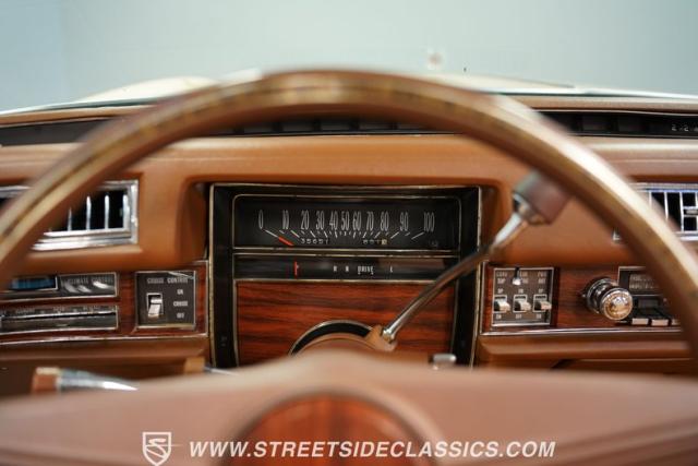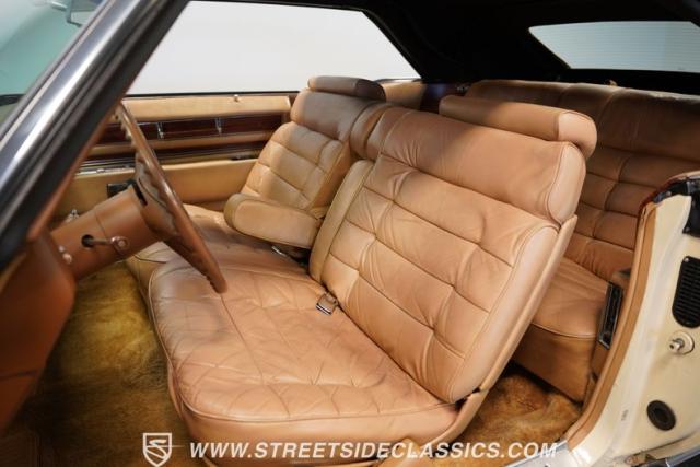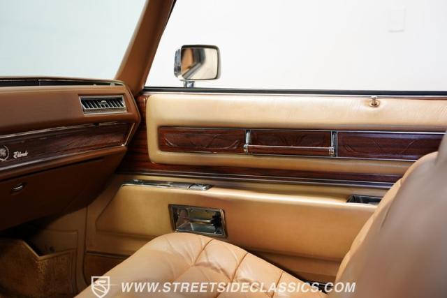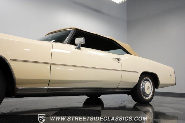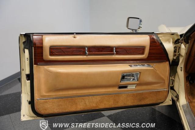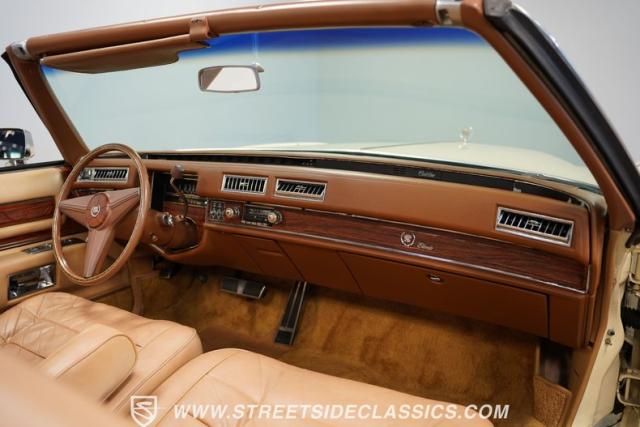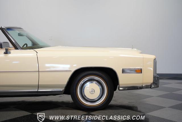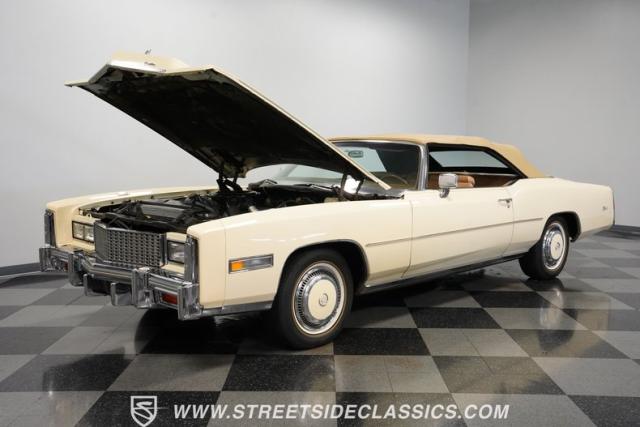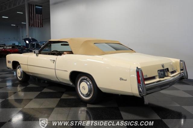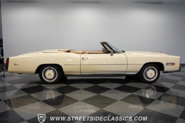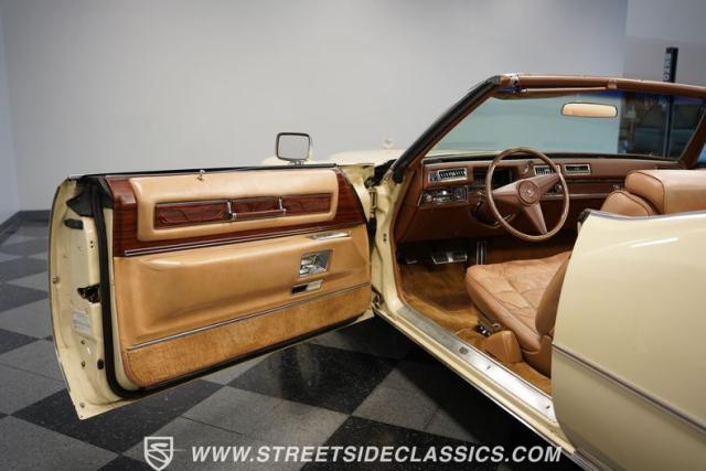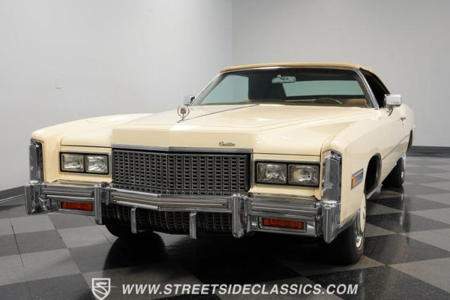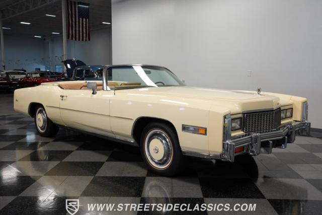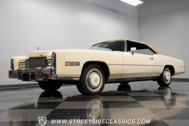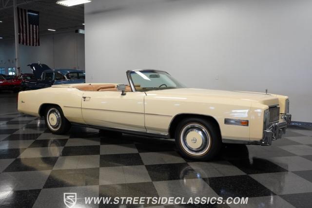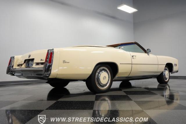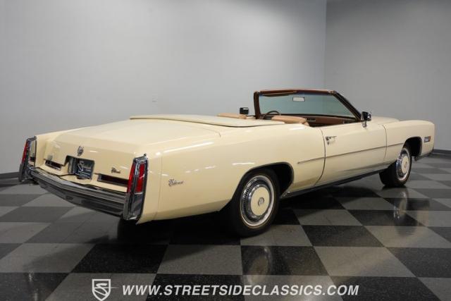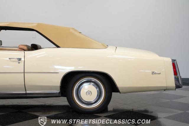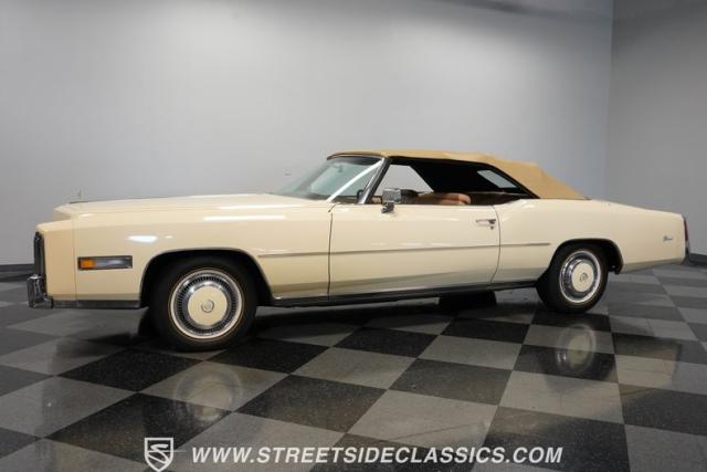This 1976 Cadillac Eldorado Convertible stretches an impressive 224 inches, making it one of the longest production convertibles ever built-the Calumet Cream exterior sparkles in the light, accentuating the car\'s iconic fins and egg-crate grille. Chrome bumpers and trim add a luxurious touch to the already opulent design. The power-operated beige vinyl convertible top folds away smoothly, inviting open-air cruising. This Eldorado rolls on 15-inch wheels wrapped in 235/70R15 tires, giving it a commanding presence. A mirror thermometer on the exterior adds a unique functional accent to this classic Cadillac.