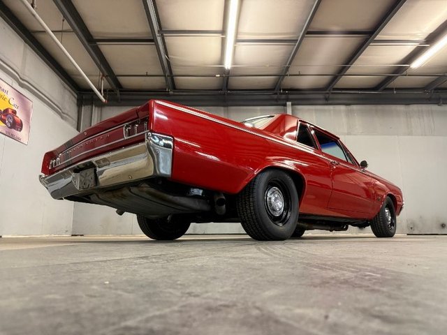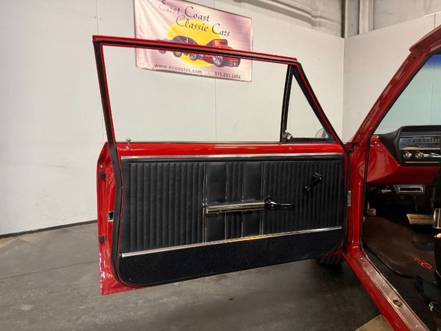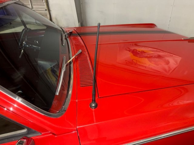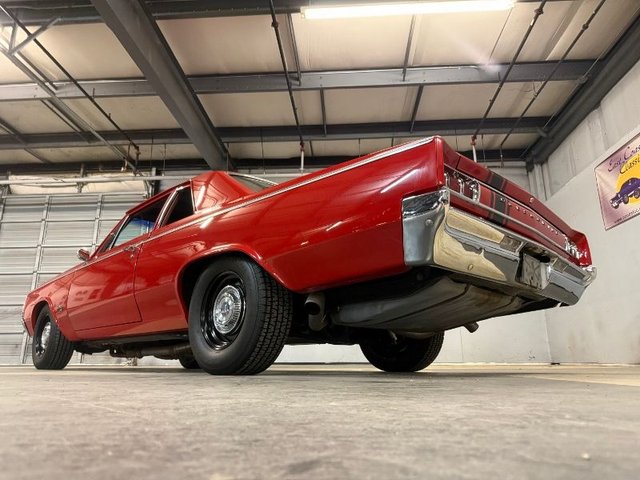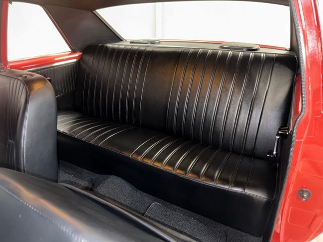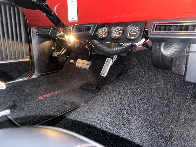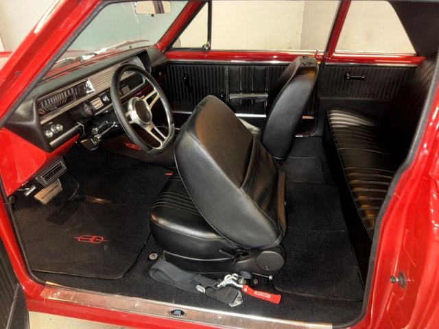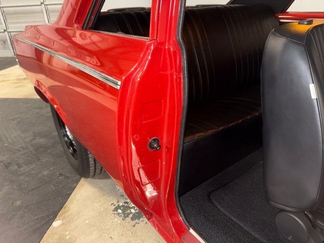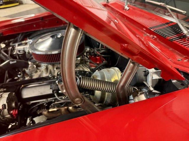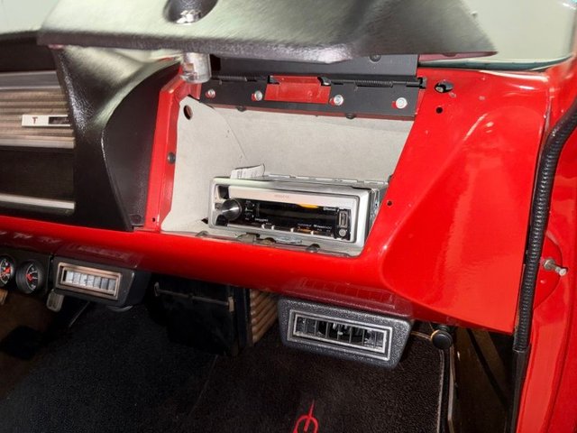 Painted a beautiful Red with a black stripe on drivers’ side, dual outside good, door handles, body side molding, window trim, grill, rear tail lights and bezels, front & rear bumpers all very good. Black powder coated 15" rims on GM OEM, newer BF Goodrich TA Radial tires 225 70R15 front-235 70R15 rear, spare tire on power coated rim also, all rubber newer, all glass is good, hubcaps like new. Hotchkis tubular front "A: arms w/tall ball joints, Viking 2-way adjustable front coilover shocks. Rear Hotchkis adjustable suspension with Hotchkis springs and Ride Tech shocks. Custom 9" Ford rear end with 3.5:1 Posi traction, front disc brakes with Wildwood rear drums. 9" Dual Diaphragm Booster with proportioning valve. You don’t see many like this! A real attention getter!