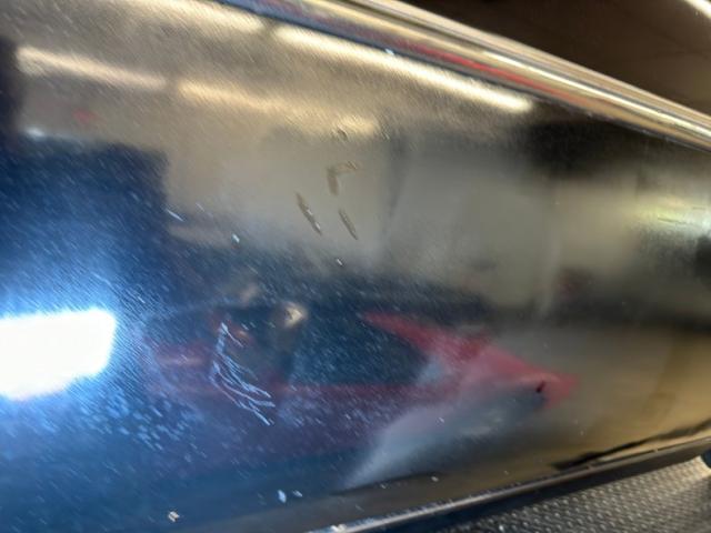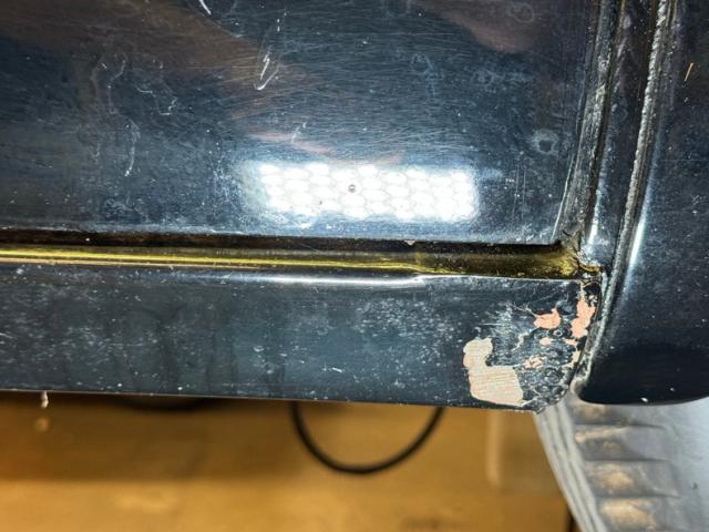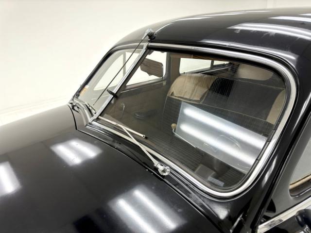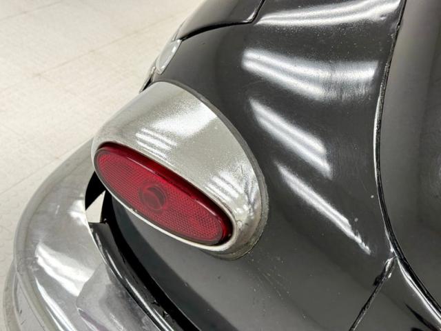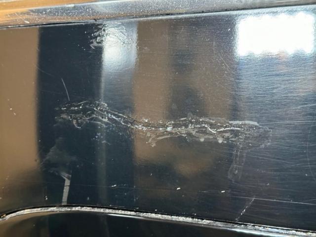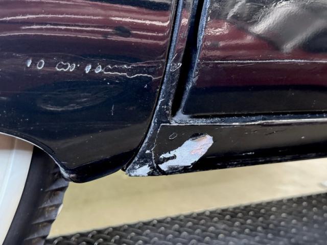 Single stage black paint shines with satin glory. The Packard pinched grille crowns stretches of chrome and a huge bumper that\'s akin to a locomotive cow catcher is below. Along with the headlight rings, futuristic hood emblem, and other metal bits, the bumpers will need some polishing to bring back to full shine. Proportionally large, the profile of the car reveals big doors, an enormous hood, and a high roofline that not only provides interior space but flows into a bowed trunk between bulging fenders. It\'s an impressive piece of machinery. And for such a huge car, the tail lights seem diminutive as two small ovals proved adequate in 1949. White wall tires surround 15-inch wheels wearing Packard hubcaps and Hallelujah, they\'re all there, because nice replacements can be costly. The rear wheels of course, are mostly obscured by the stylistic low wheel opening further enclosed with fender skirts. Imperfections in the paint include an area of cracking, some mixing pieces, various scrapes and scuffs, previous touch ups, and evidence of Bondo repairs.