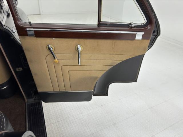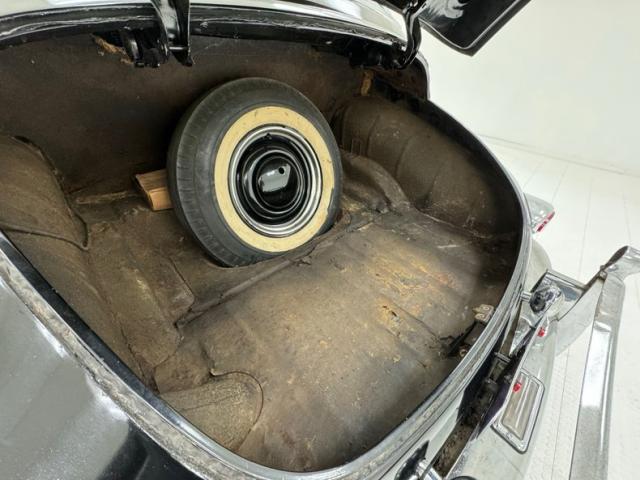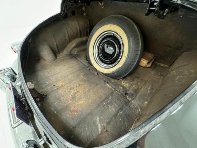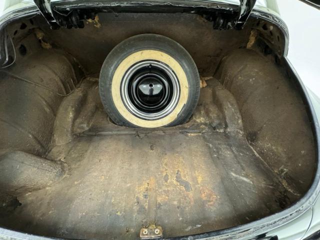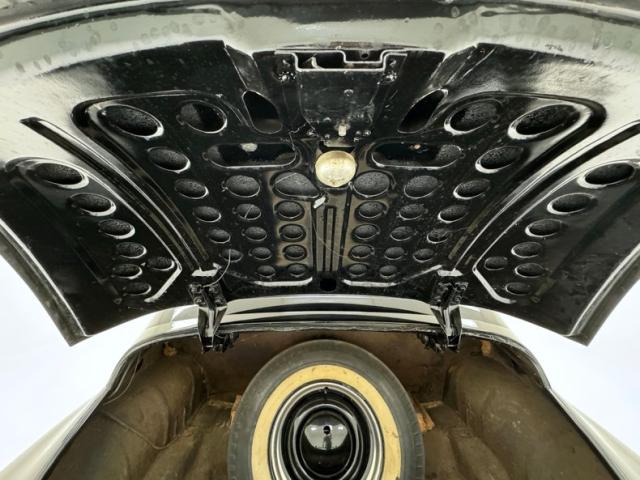 Simple patterned cloth door cards, each topped with an elegant wood painted steel crown, show some water mark staining, but are intact. The front bench seats combine vinyl panels with an airweave cloth insert. It\'s seen better days with tears in several places and discoloration. The rear seat fairs better in more of a broadcloth pattern with vinyl panels. Some of the padded seat back of the front has sustained some damage, possibly mice, while its grab rail is in good condition. The wonderful center cap of the steering wheel has Packard written in silver seemingly under glass, while the half horn ring arches downward below two metal topped spokes. A vintage Texaco branded steering assist knob is on the wheel. Lacquered wood makes up the sculpted dashboard which houses the gauge cluster in all its Art Deco grace while a vintage traffic light viewer is mounted on the steering column, usually reserved for cars with a Fulton style visor. The center of the dashboard is home to a speaker, control knobs and a vertically mounted AM radio. Covering the floor we note a thin textured mat under rubber mats in the front and somewhat more plush low pile carpet in the back. The cavernous trunk has no covering and will benefit from restoration.