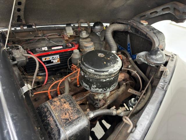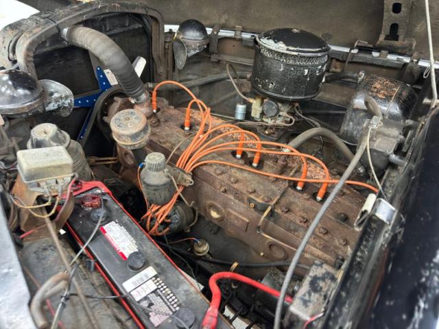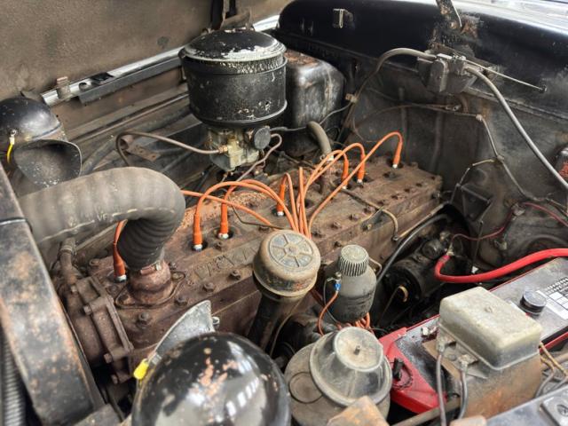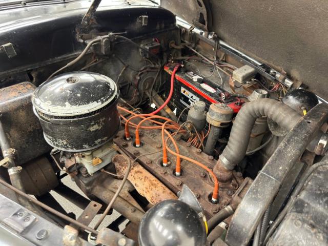 A 288ci inline 8 cylinder engine is under the massive hood and is rated at 135 horsepower. It receives fuel from a Carter WGD728 2-barrel carburetor and is set into motion via a 3-speed manual transmission with a column shifter. Drum brakes are found in the front and rear of the car. The engine bay shows patina and surface rust but is complete.